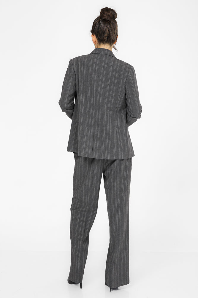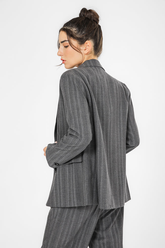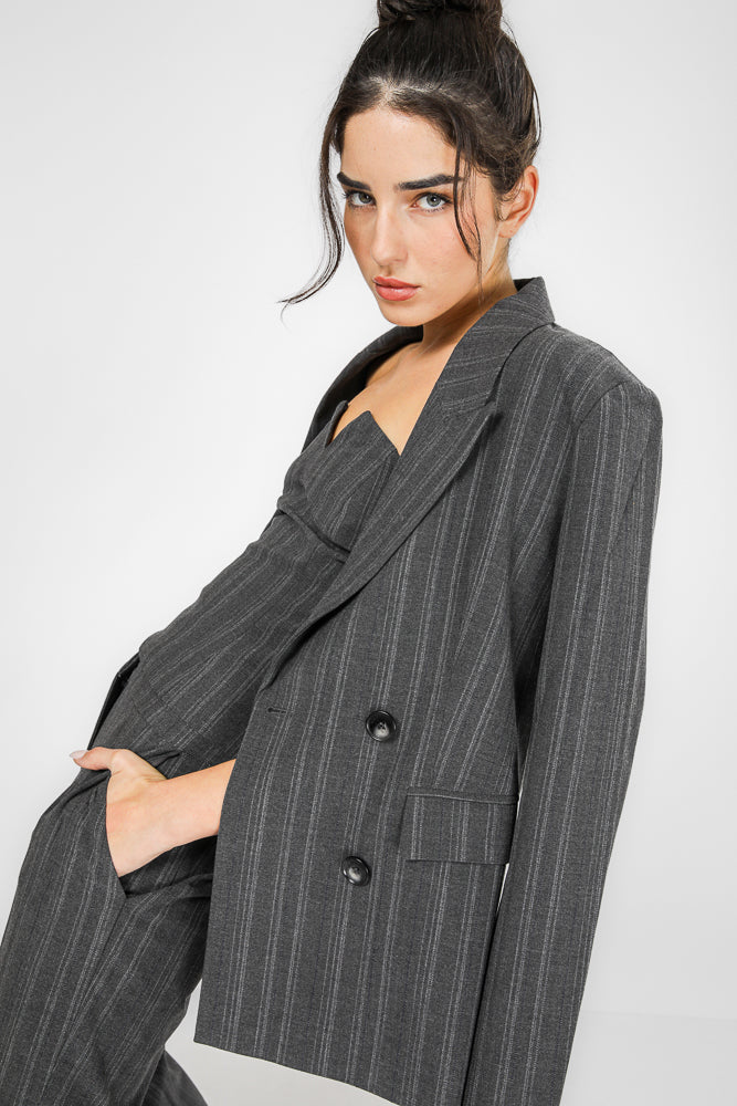 בלייזר לנשים מבית המותג היוקרתי KENNETH COLE, בצבע אפור עם פסים בעיצוב אלגנטי המתאים לערב וגם ליומיום, עם סגירת כפתורים כפולה .