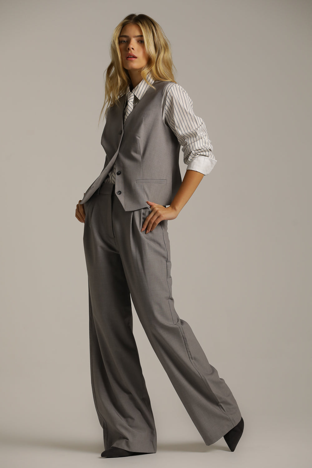 וסט מבית המותג KENNETH COLE לנשים בצבע אפור, מעוצב בגזרה מחויטת למראה אלגנטי, באורך המותן, בעל צווארון וי, כיסים דקורטיביים מקדימה וכפתורים לפתיחה וסגירה בחזית.