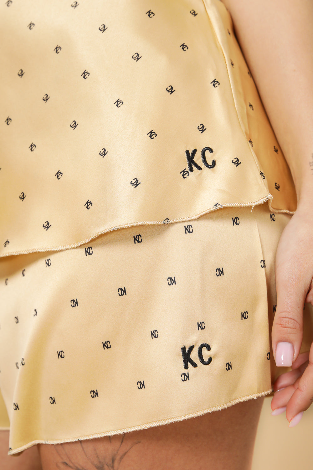 סט פיג'מה קצרה מבד סאטן נעים בצבע זהב עם KC בצבע שחור לאורך כל הפיג'מה. הסט כולל חולצה מכופתרת בעלת כיס ומכנסיים קצרים בצבע שחור.