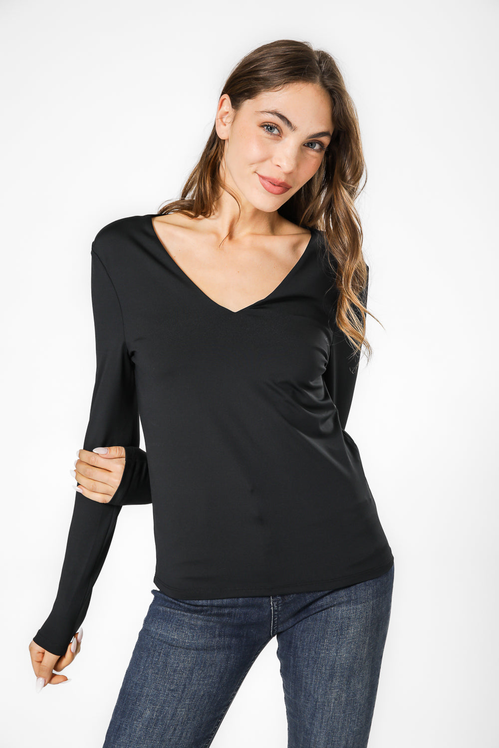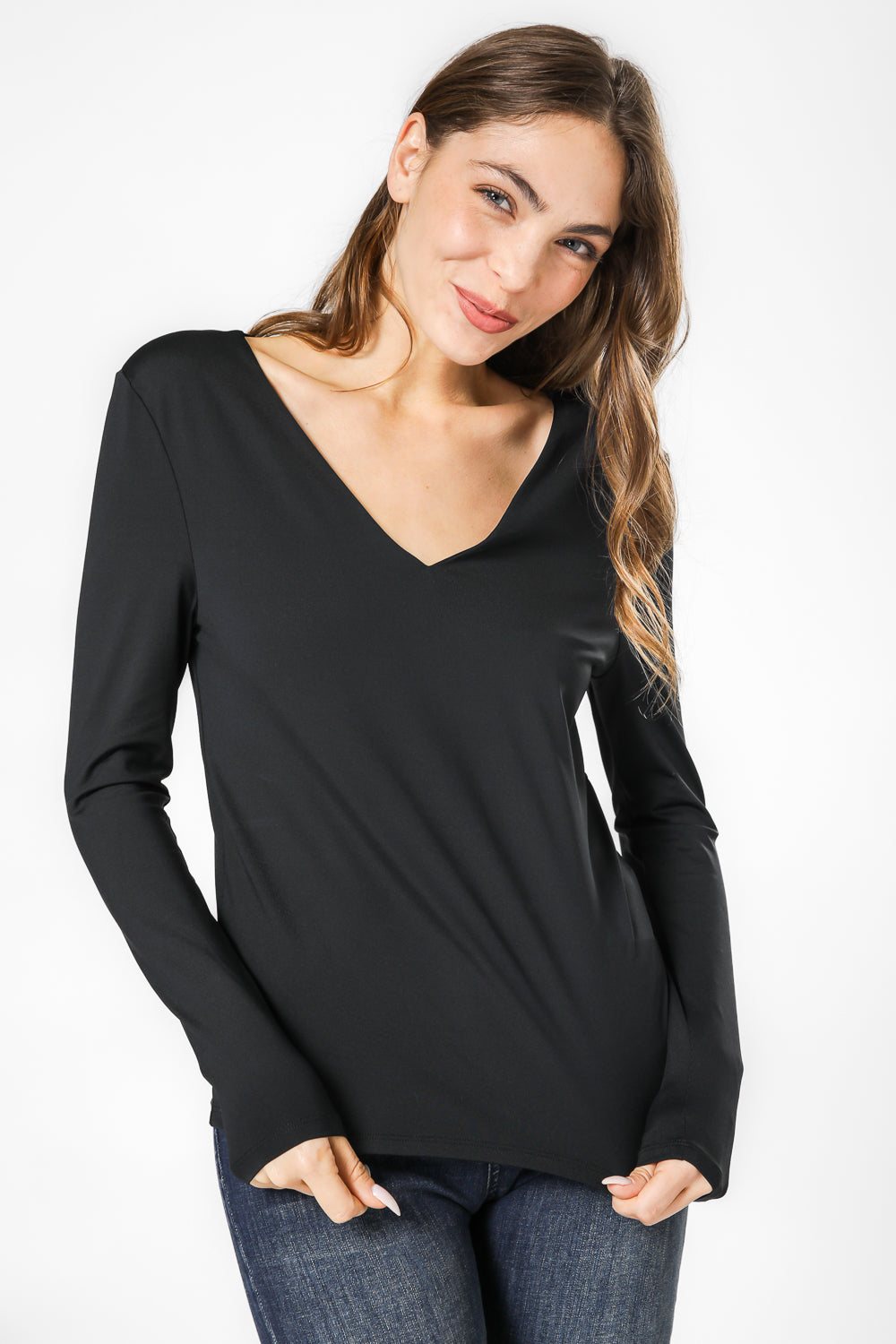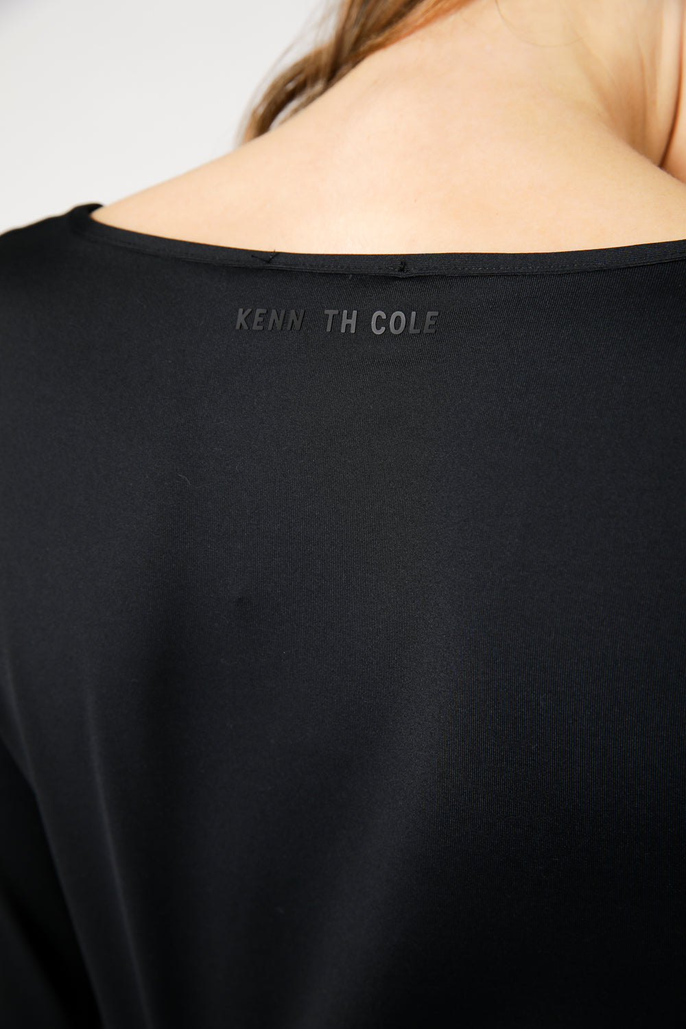 חולצה לנשים מבית המותג KENNETH COLE מבד אלסטי בגזרה צמודה, עם שרוולים ארוכים וצווארון וי עמוק.