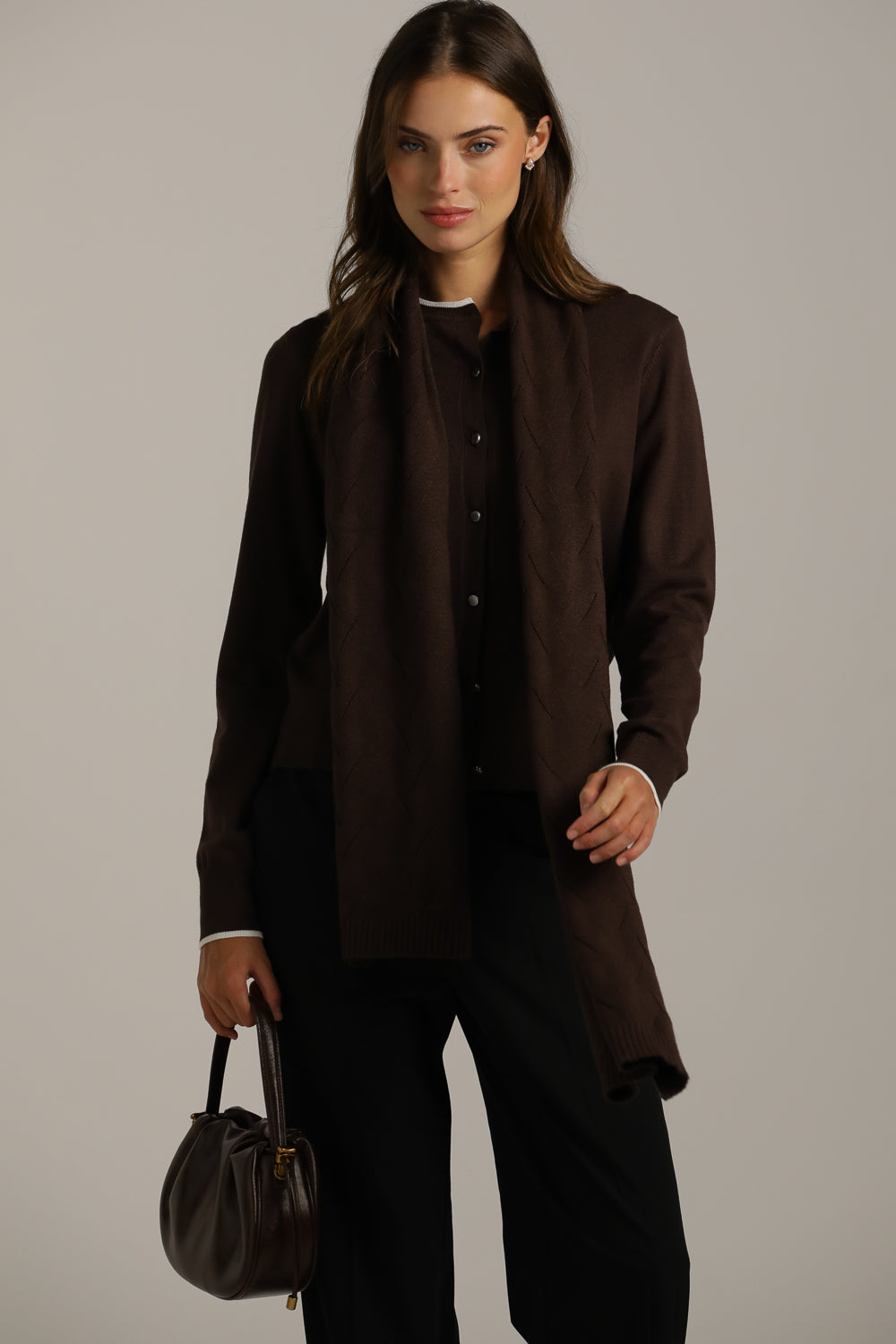 צעיף מבית המותג KENNETH COLE לנשים, עשוי בד סרוג במרקם חלק ונעים למגע, בעל עיצוב הכולל דוגמת חירור עדינה לאורך הצעיף ומתאים לליפוף סביב הצוואר או להנחה רפויה על הכתפיים.