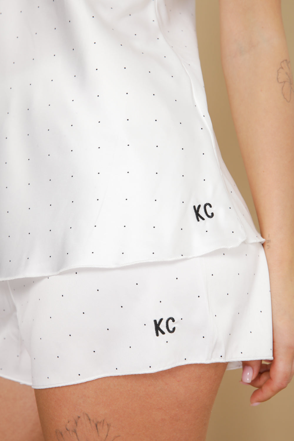 סט פיג'מה קצר מבד סאטן נעים. הסט כולל גופיה ומכנסון בצבע לבן עם נקודות שחורות.