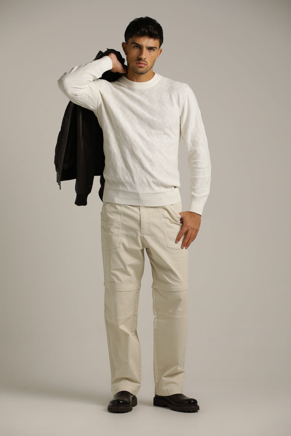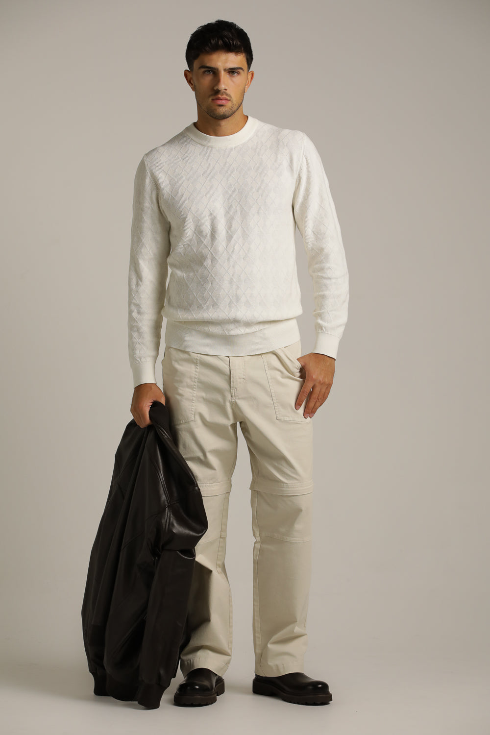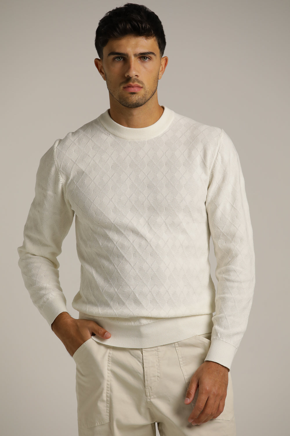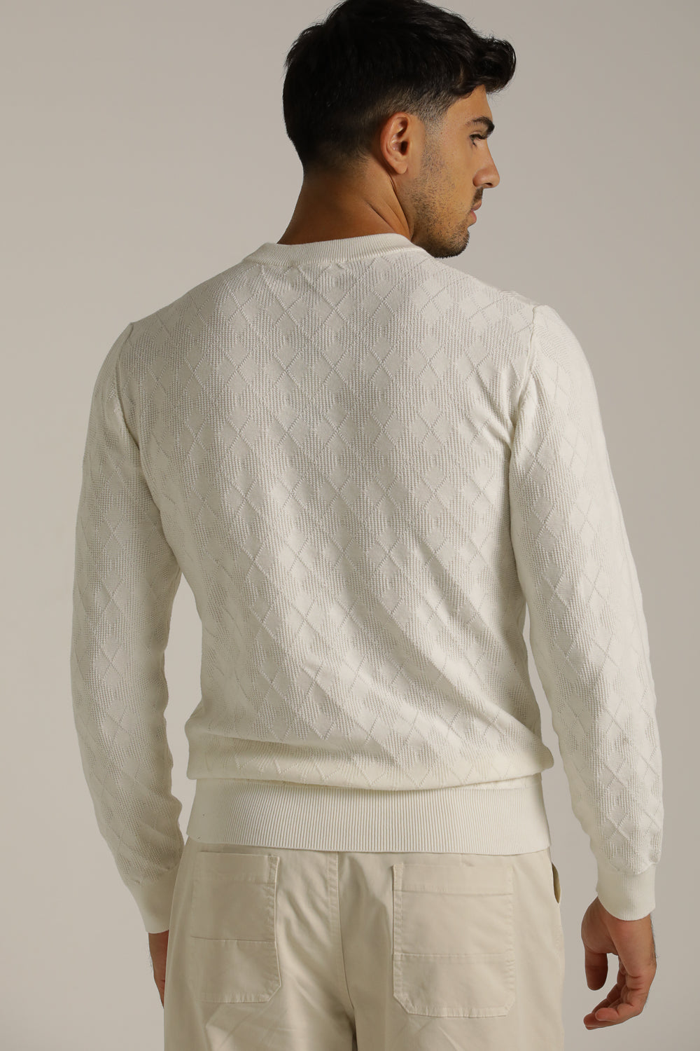 סריג מבית המותג KENNETH COLE לגברים בצבע לבן, עשוי מבד 100% כותנה דק ונעים, בעיצוב מעויינים לאורך כל הסריג, בעל שרוולים ארכים, צווארון עגול וסיומת אלסטית בקצוות החולצה והשרוולים.