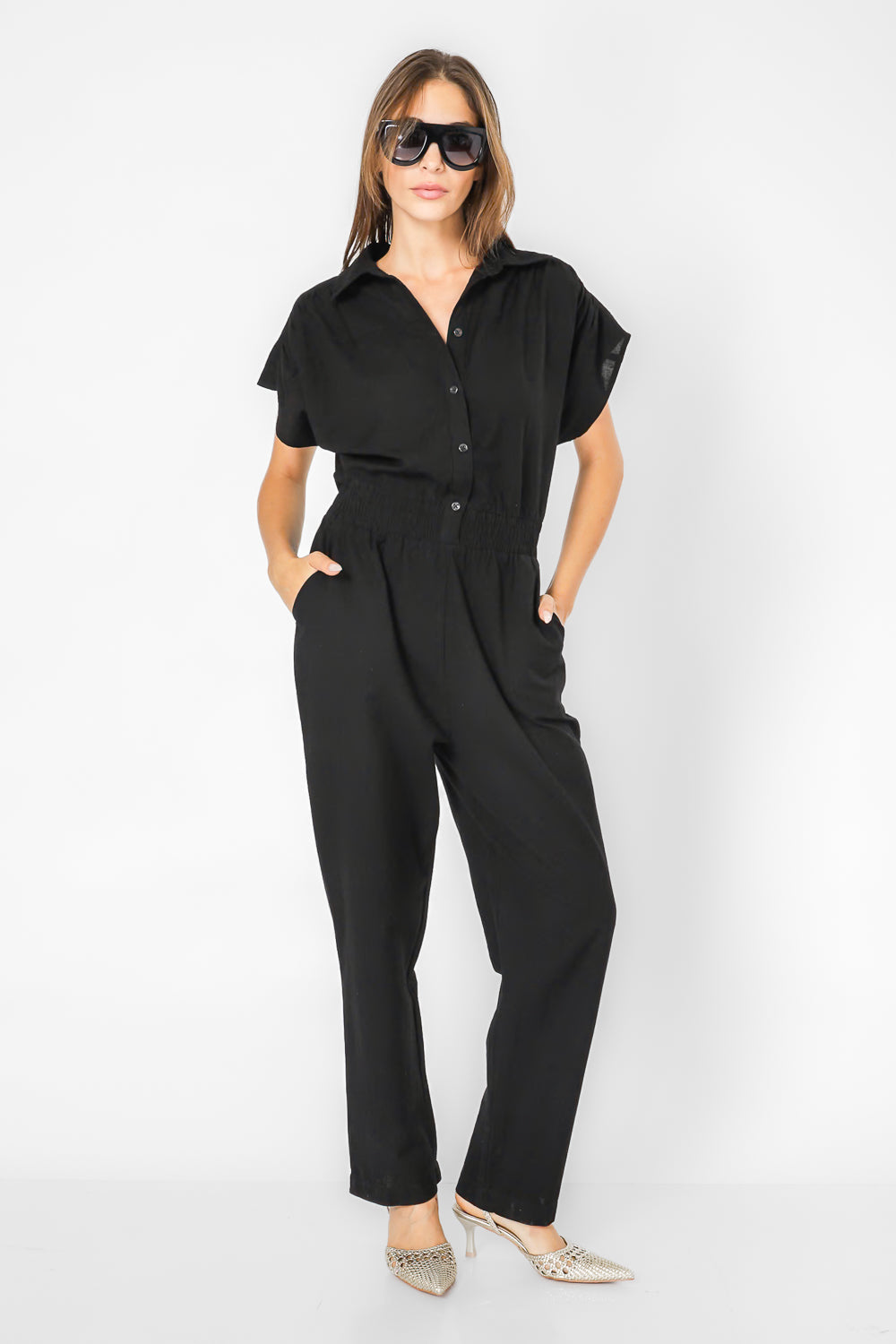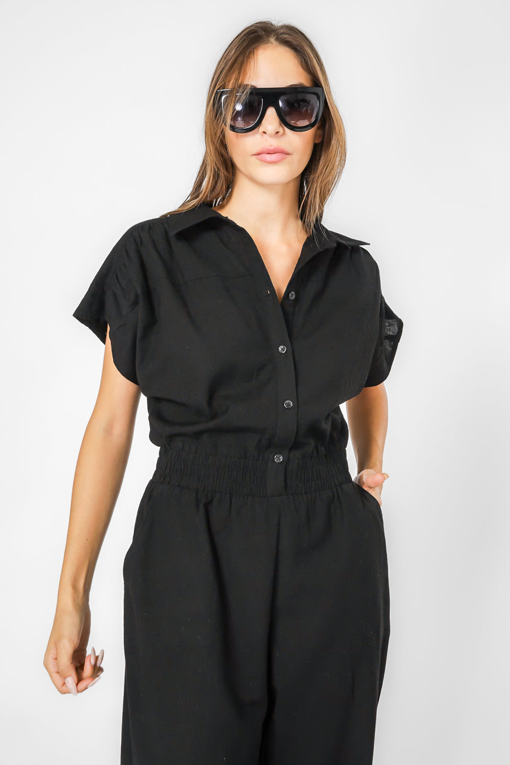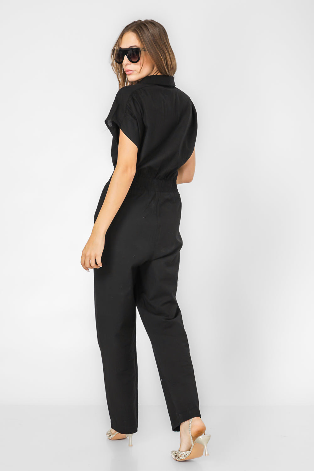 אוברול לנשים מבית המותג KENNETH COLE, בצבע שחור , עם שרוולים קצרים , צווארון וכפתורים מקדימה, מותן אלסטית ושני כיסים צדדיים.