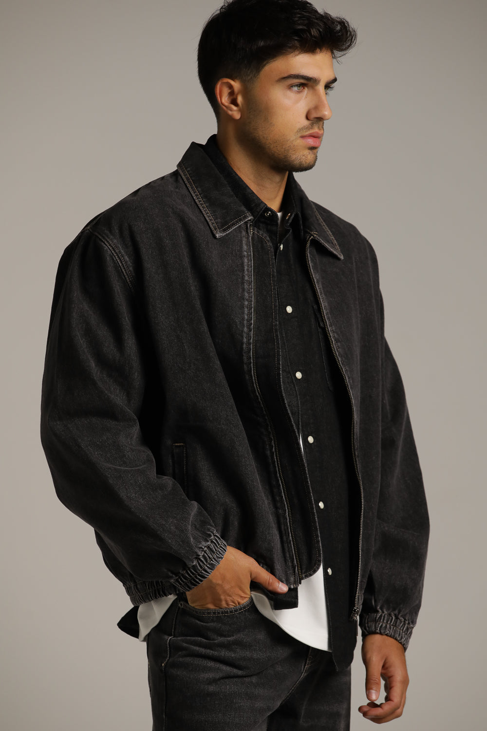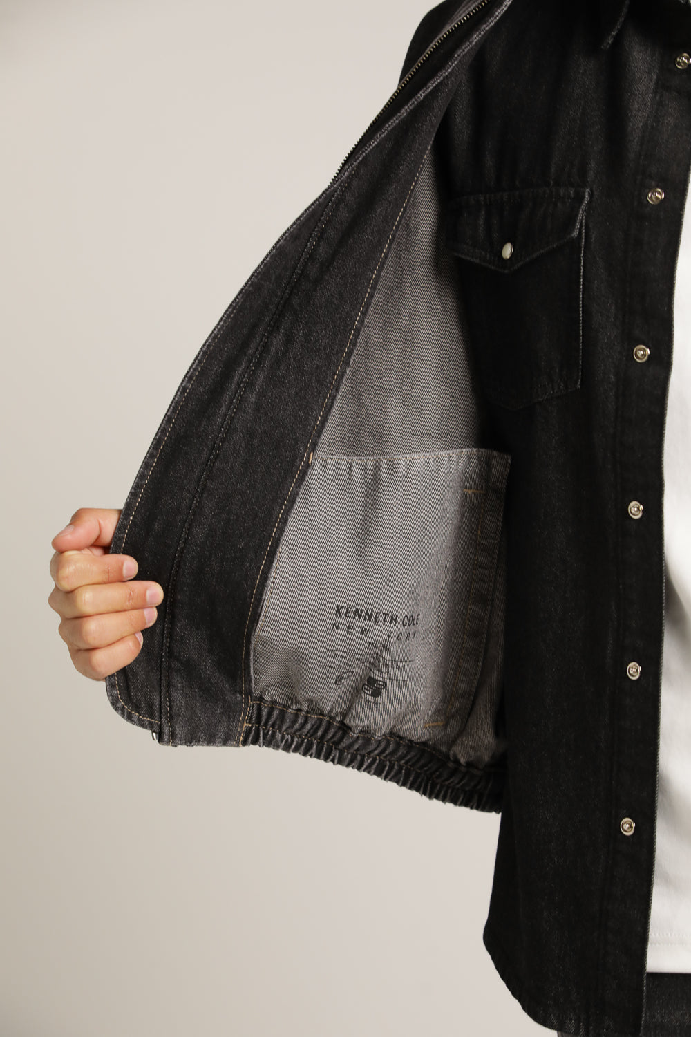 ג'קט ג'ינס מבית המותג KENNETH COLE לגברים בצבע שחור, המעוצב במראה שטוף, בגזרת בומבר, בעל כיסים בצדדים וכיס פנימי, שרוולים ארוכים, צווארון מתקפל למראה אלגנטי, רוכסן לפתיחה וסגירה וסיומת גומי אלסטי בקצוות הג'קט והשרוולים.
