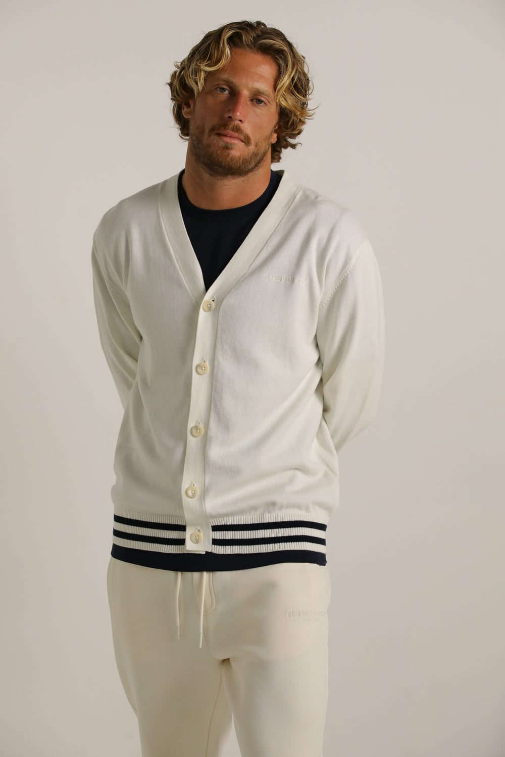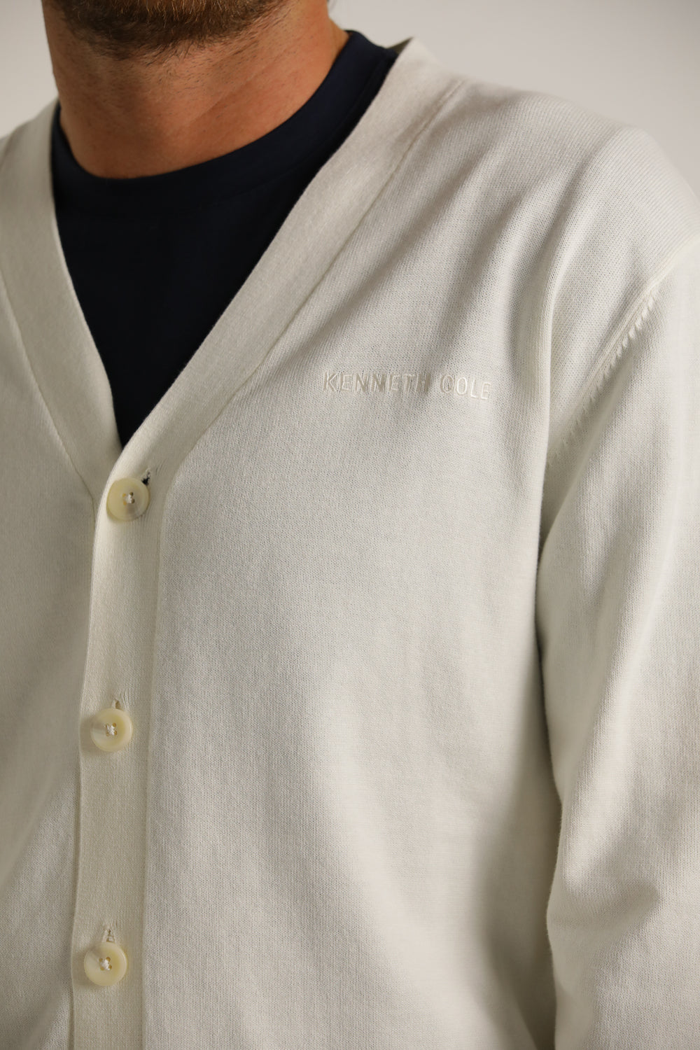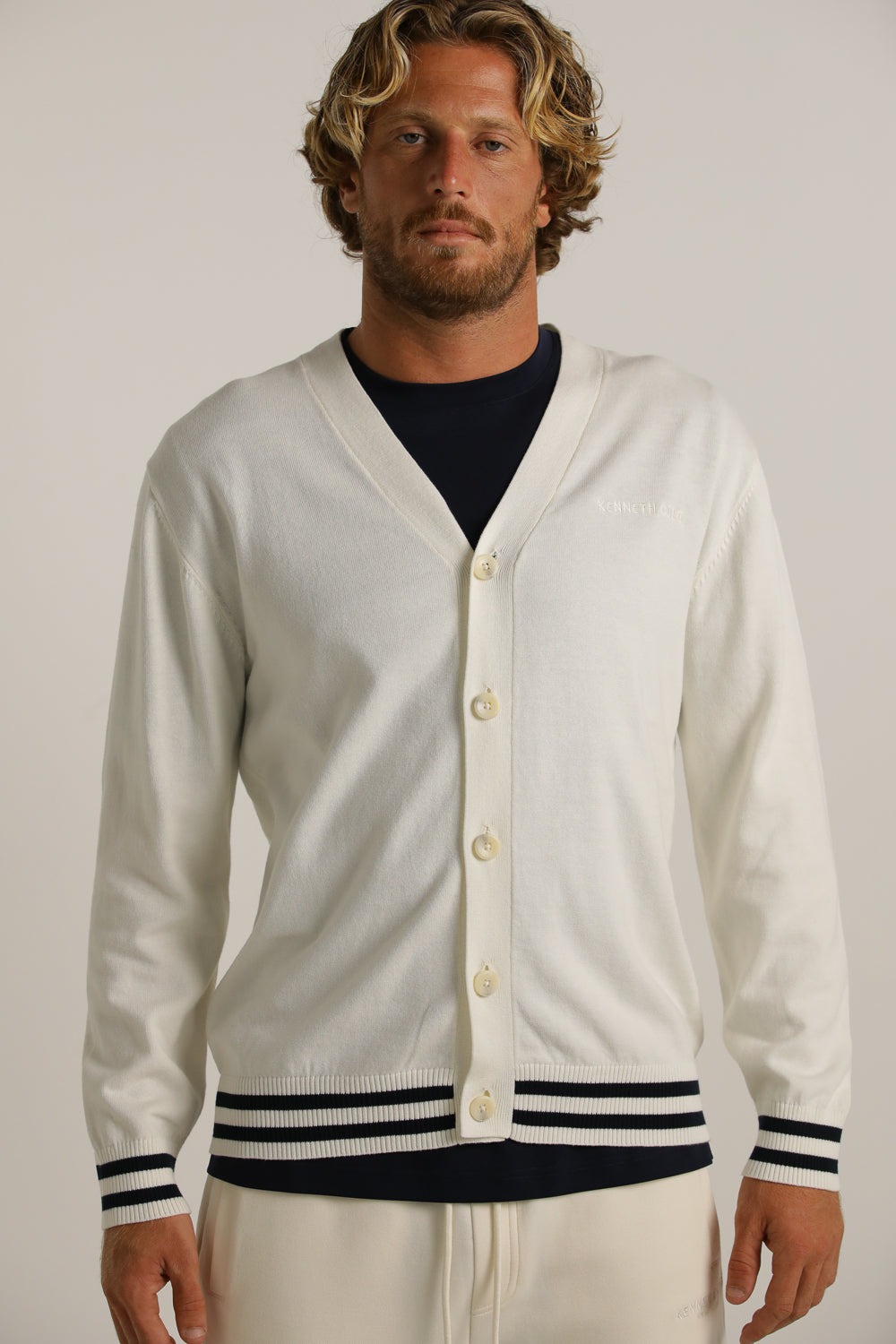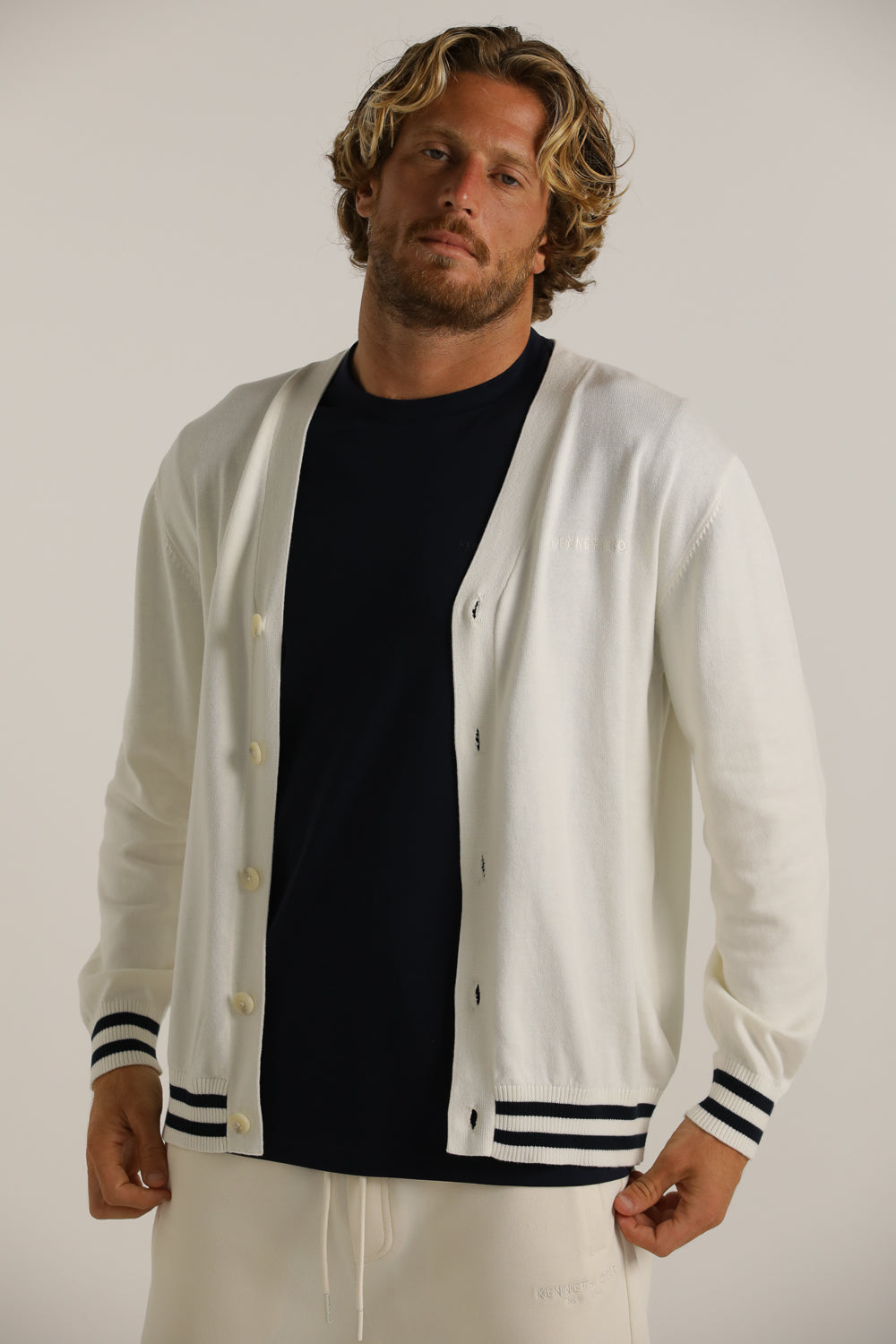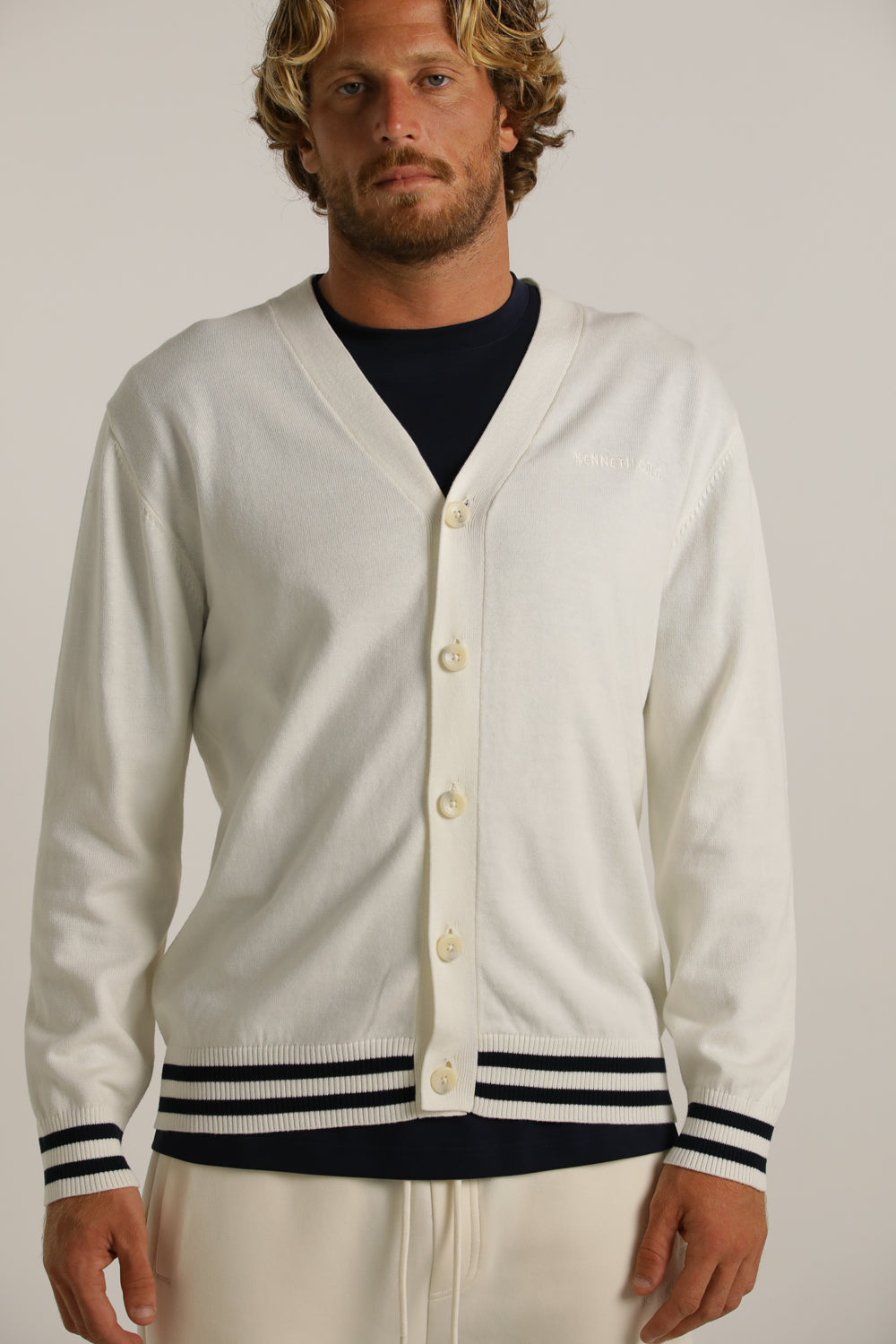 קרדיגן מבית המותג KENNETH COLE לגברים בצבע לבן, עשוי מבד 100% כותנה רך ונעים למגע, בגזרה משוחררת וקלילה, בעל מפתח וי, שרוולים ארוכים, סגירת כפתורים בחזית, לוגו המותג רקום מקדימה בצד ופסים קונטרסטים בקצה קו הקרדיגן והשרוולים.