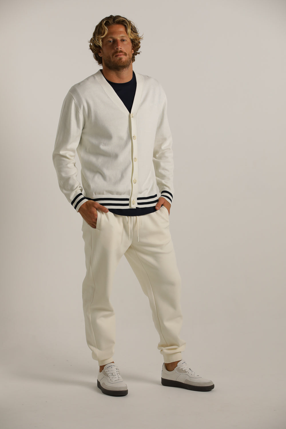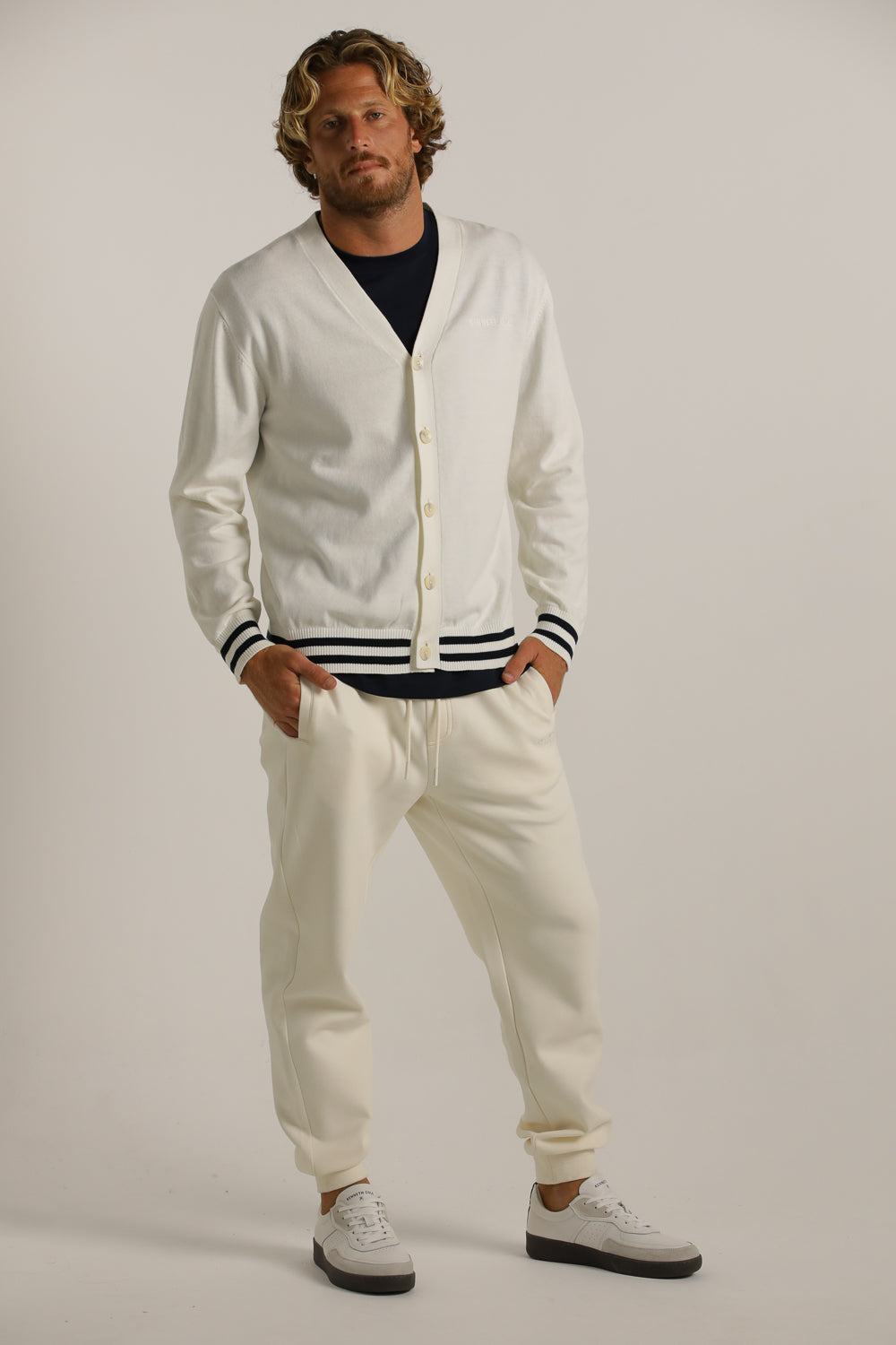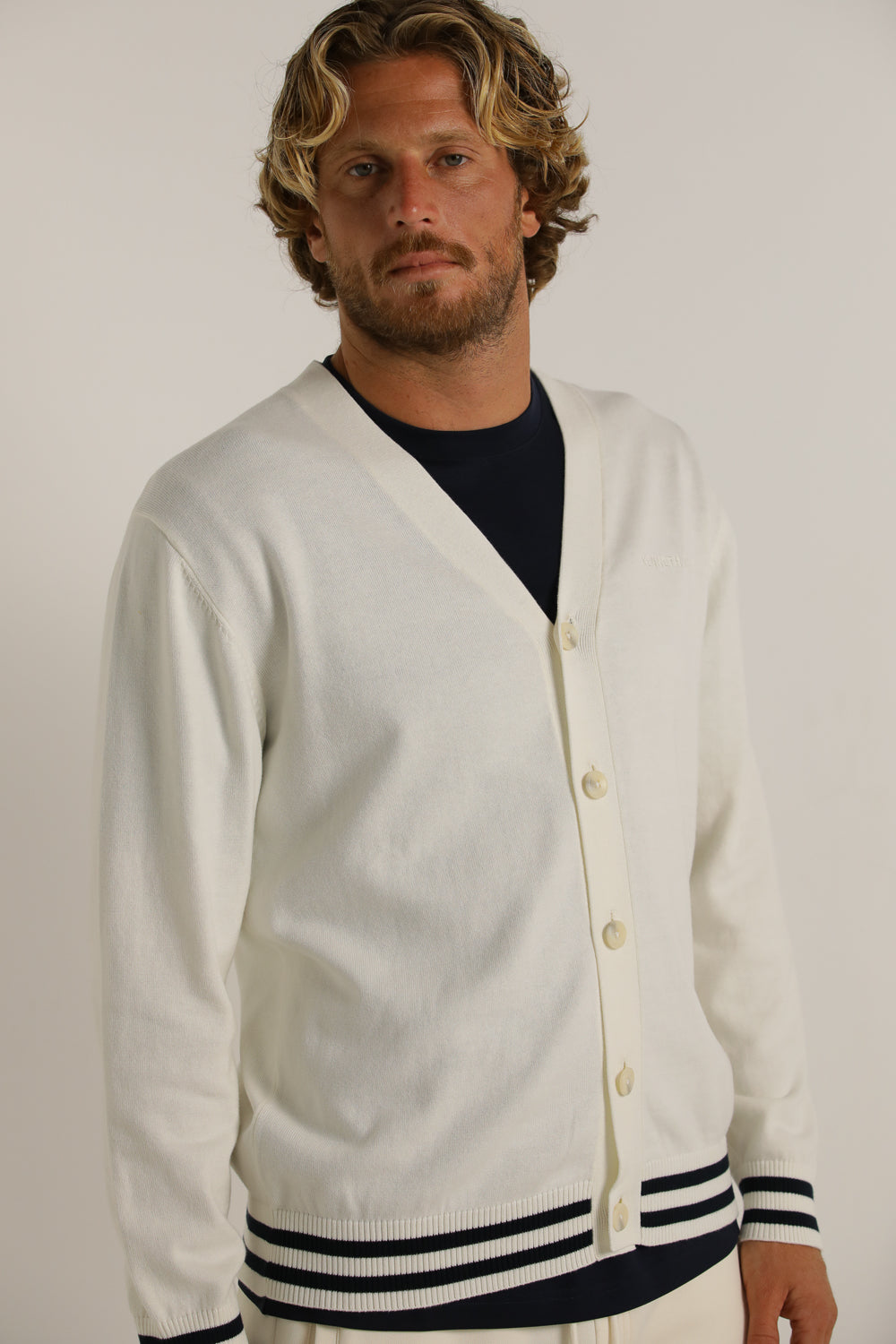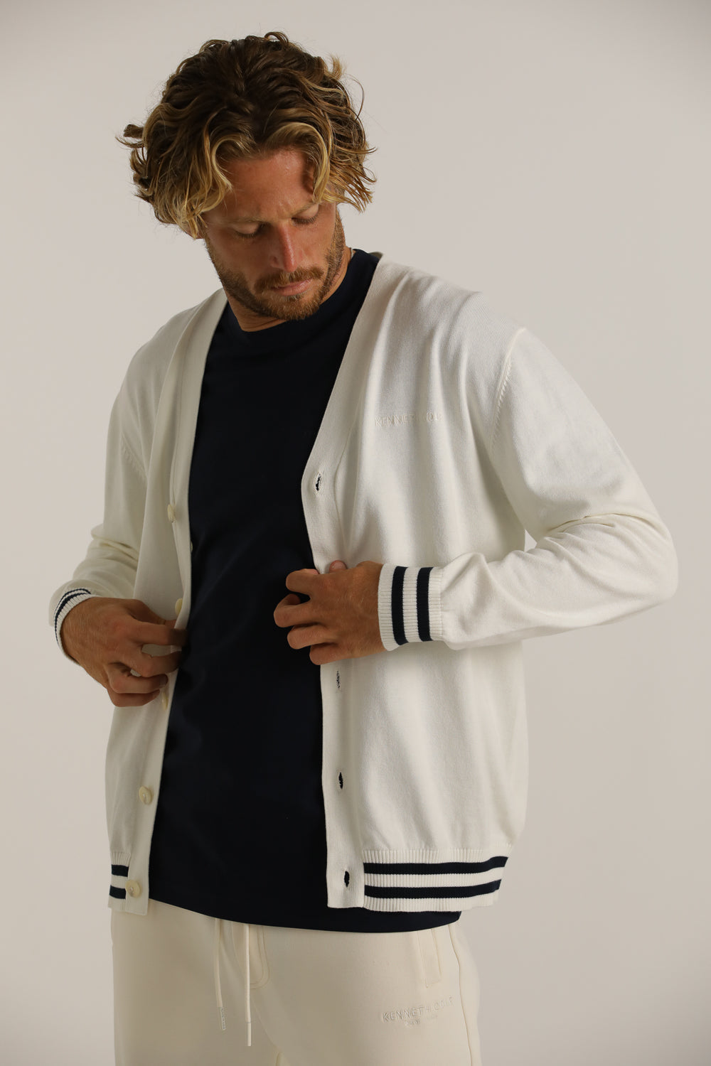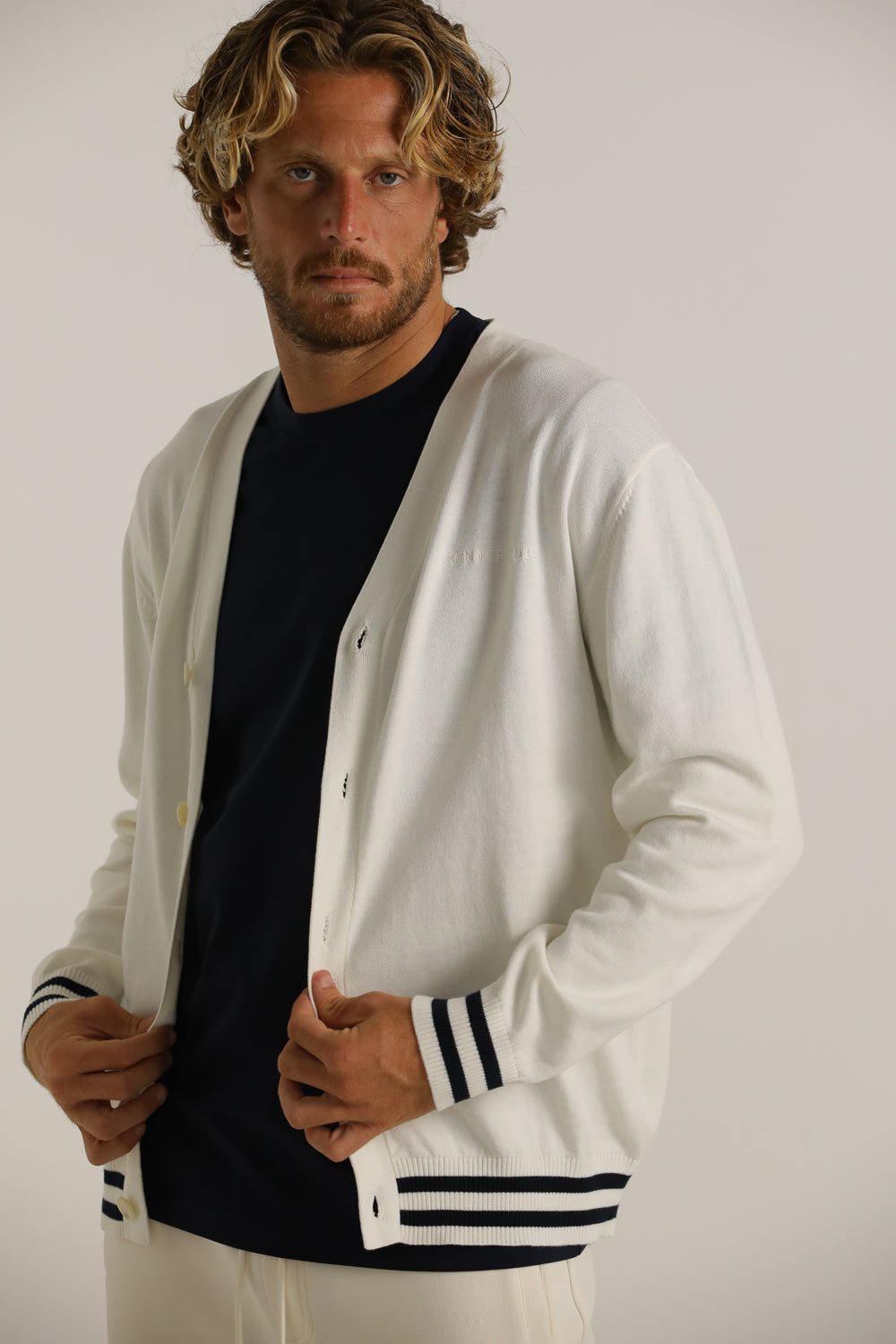 קרדיגן מבית המותג KENNETH COLE לגברים בצבע לבן, עשוי מבד 100% כותנה רך ונעים למגע, בגזרה משוחררת וקלילה, בעל מפתח וי, שרוולים ארוכים, סגירת כפתורים בחזית, לוגו המותג רקום מקדימה בצד ופסים קונטרסטים בקצה קו הקרדיגן והשרוולים.