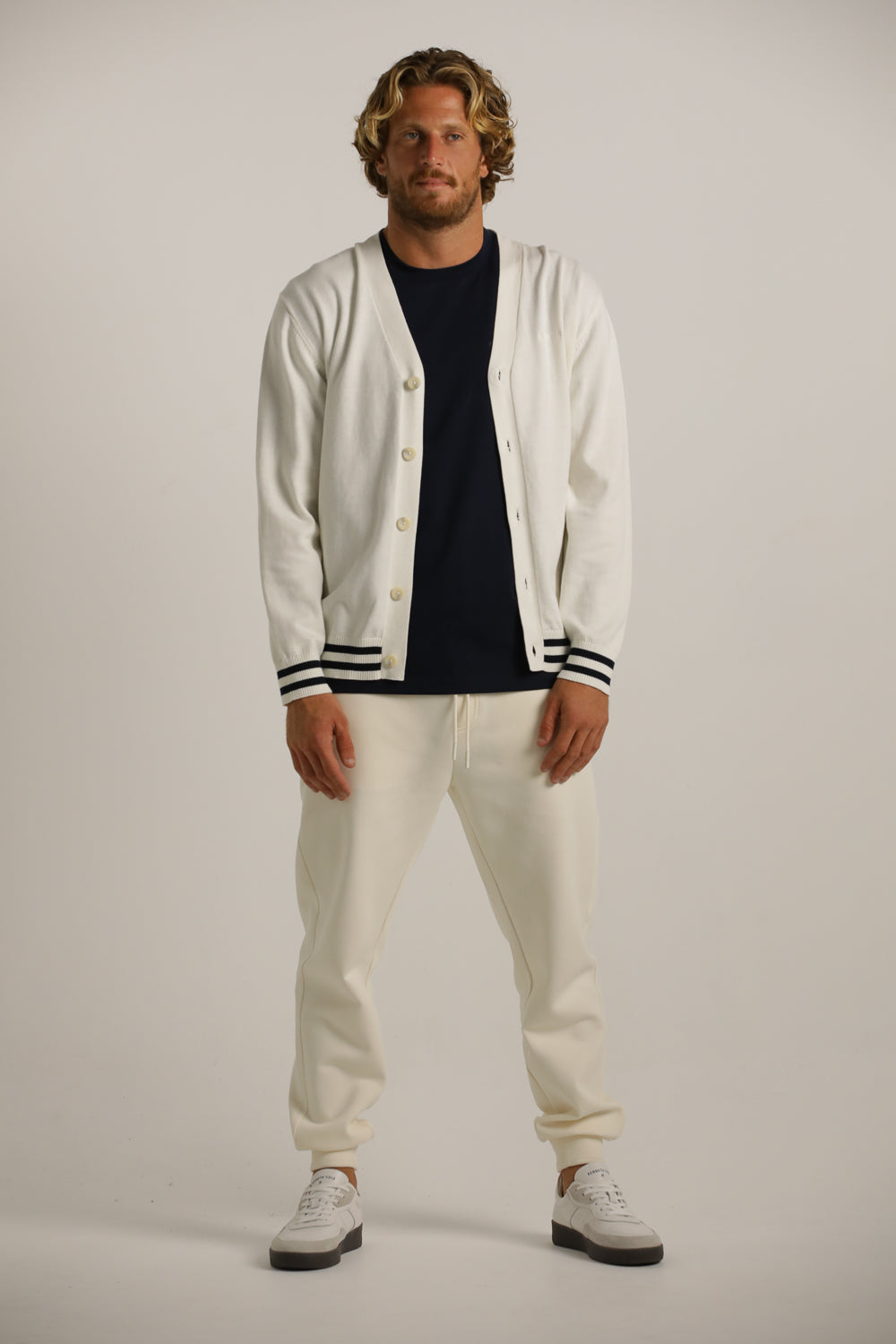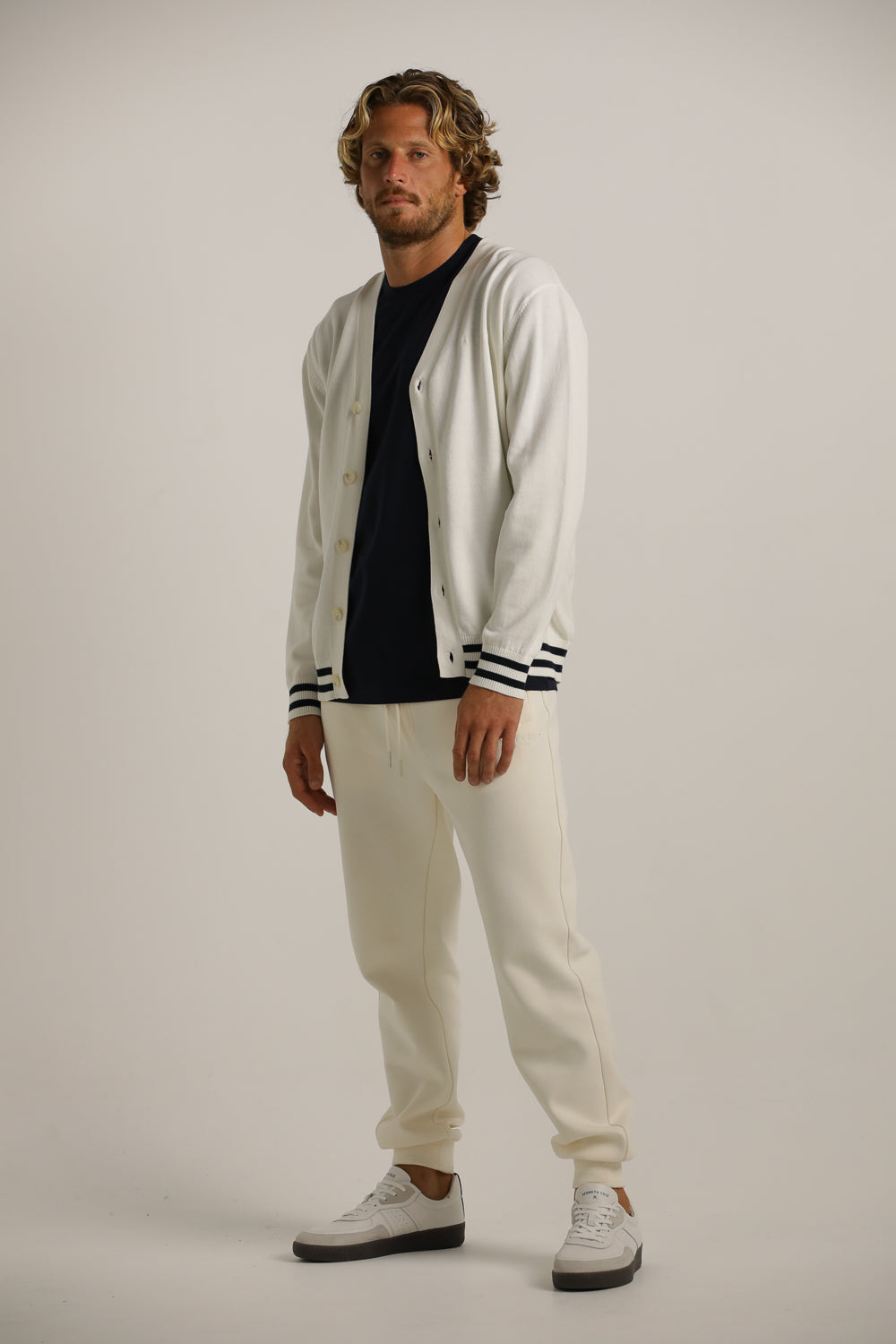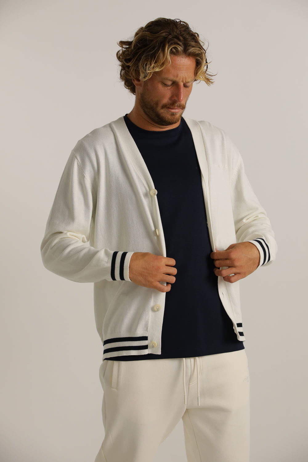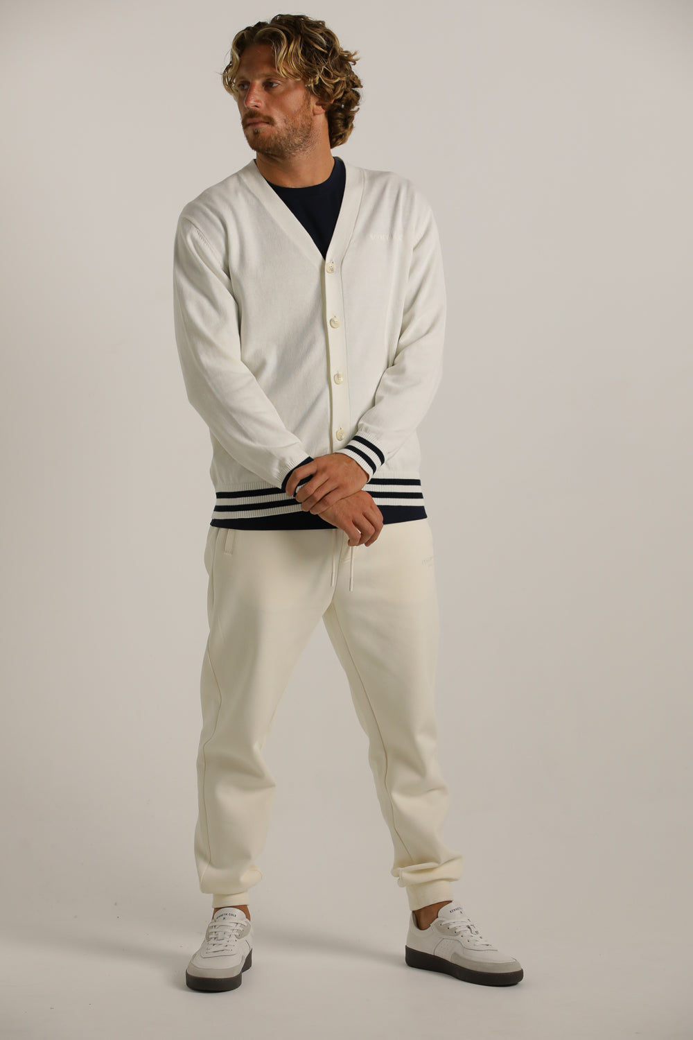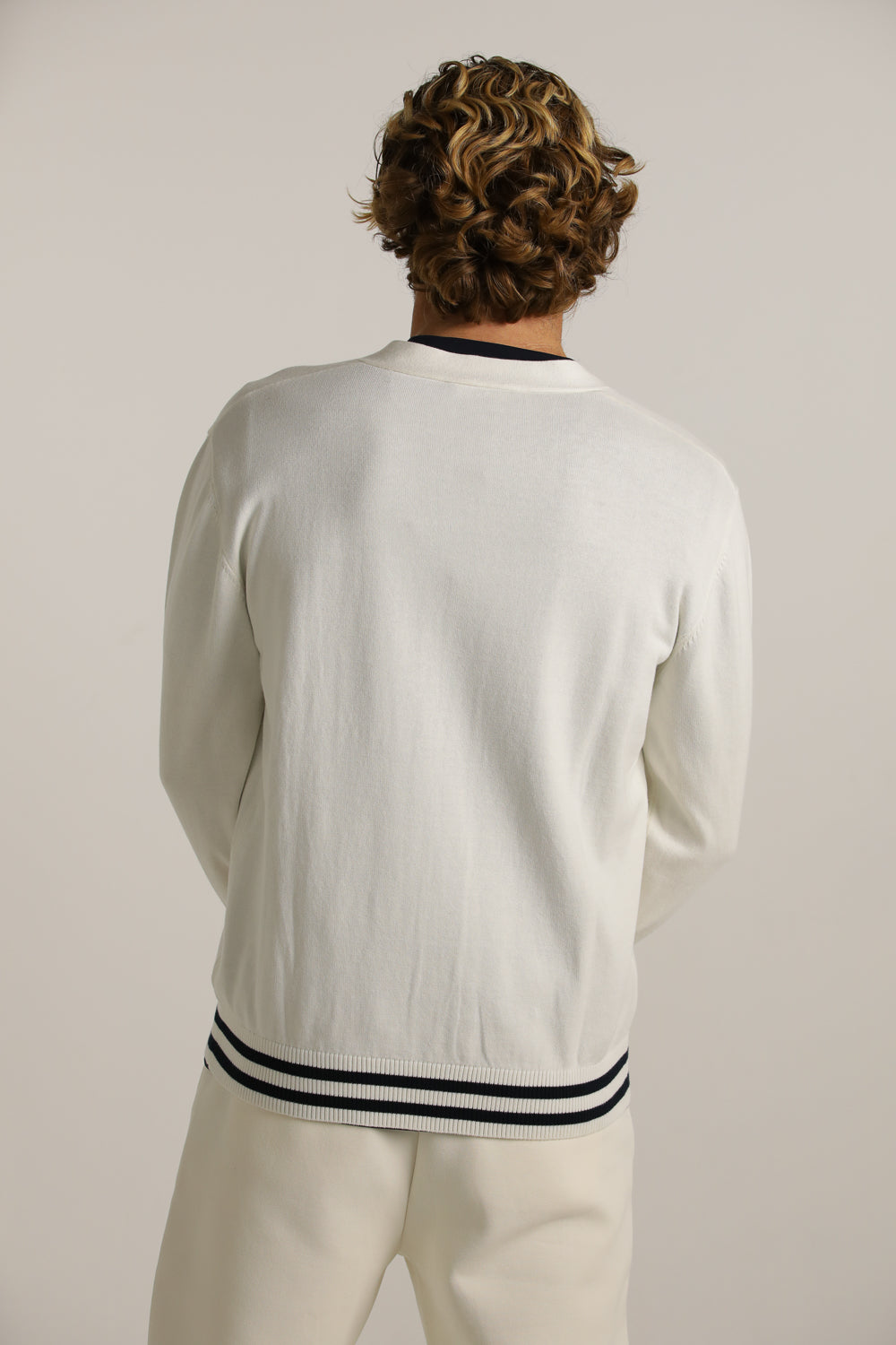 קרדיגן מבית המותג KENNETH COLE לגברים בצבע לבן, עשוי מבד 100% כותנה רך ונעים למגע, בגזרה משוחררת וקלילה, בעל מפתח וי, שרוולים ארוכים, סגירת כפתורים בחזית, לוגו המותג רקום מקדימה בצד ופסים קונטרסטים בקצה קו הקרדיגן והשרוולים.