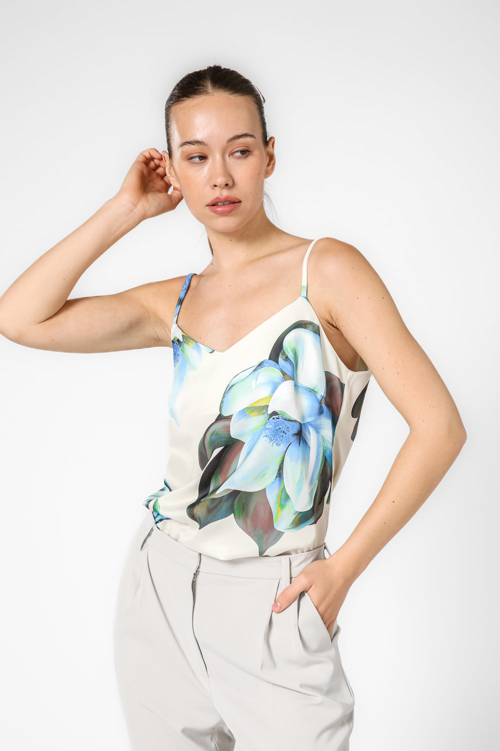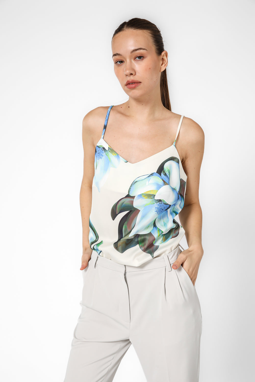 עליונית סאטן מבית המותג KENNETH COLE, עליונית בעלת הדפס פרחים עם רצועות דקיקות, סופר קלאסית המעניקה מראה נינוח במיוחד לצד מראה חגיגי