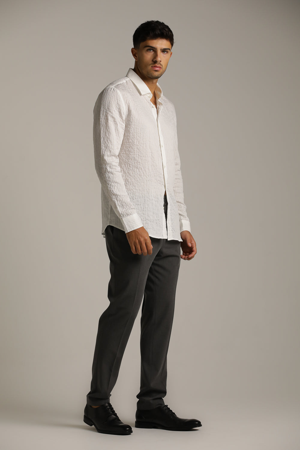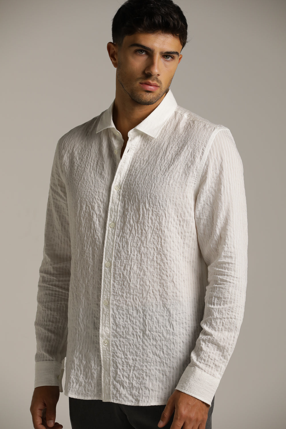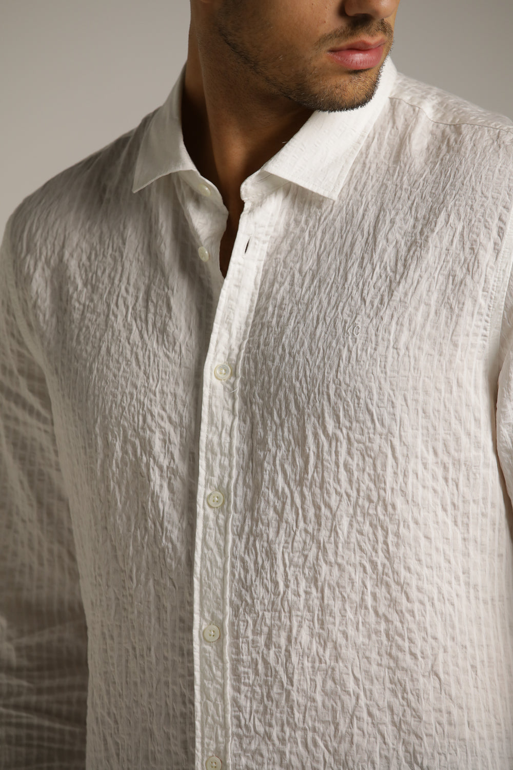 חולצה מכופתרת מבית המותג KENNETH COLE לגברים בצבע לבן, מעוצבת במראה פסים עדינים, בטקסטורת קרינקל קראנץ' עדינה למראה ייחודי, בעלת שרוולים ארוכים, כפתורים קטנים לפתיחה לסגירה ולוגו המותג רקום בקטן בחזית.