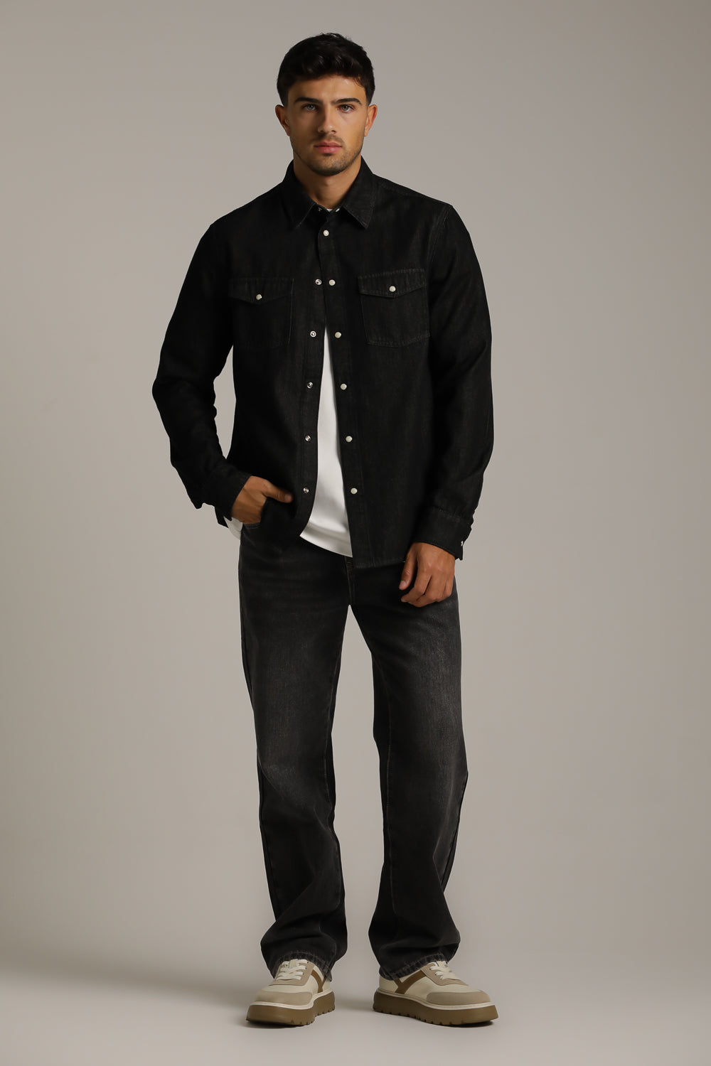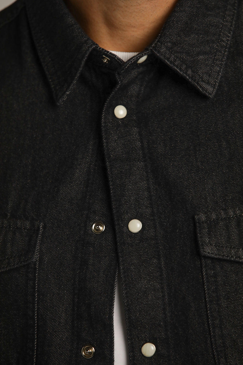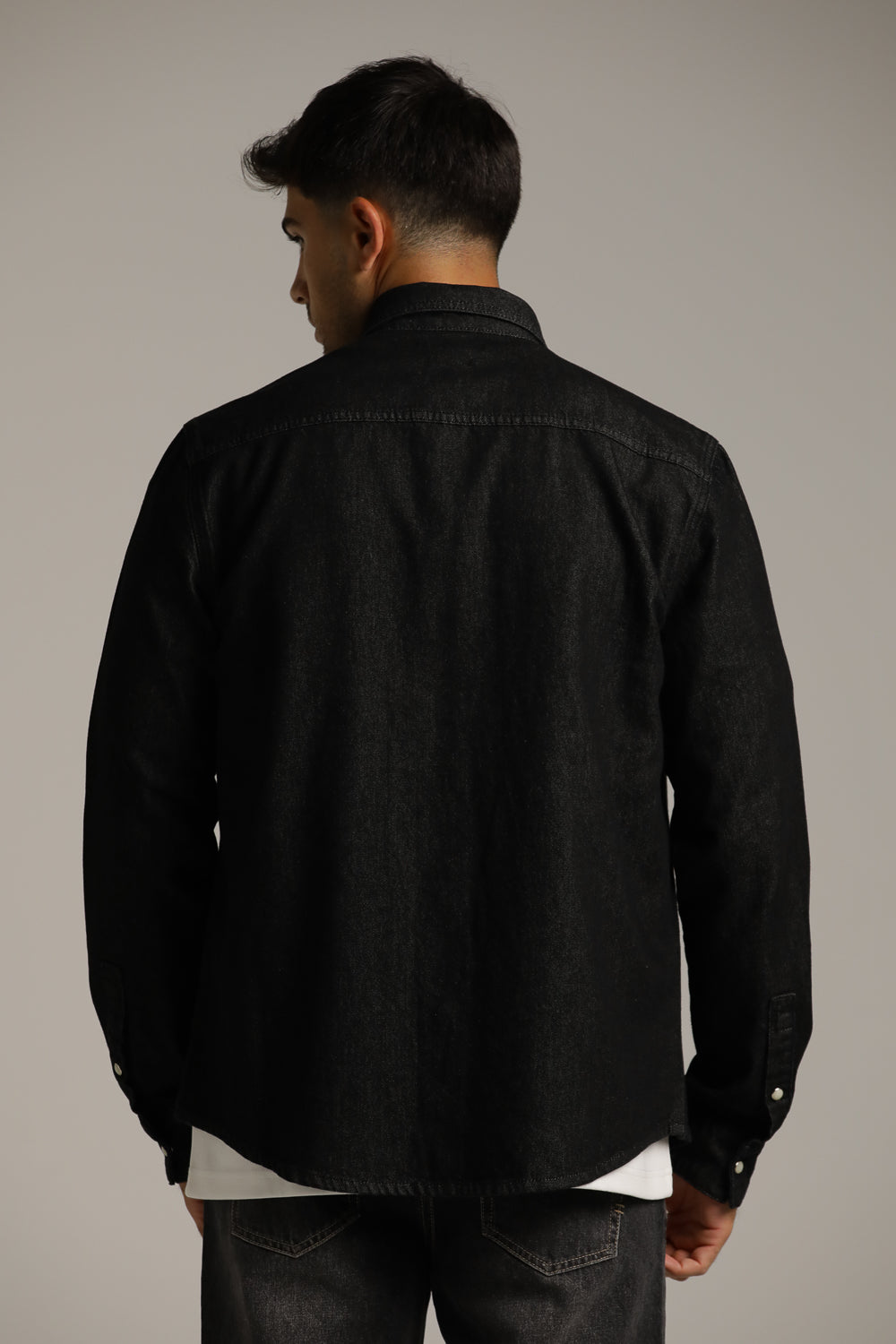 חולצה מכופתרת מבית המותג KENNETH COLE לגברים בצבע שחור, מעוצבת בסגנון ג'ינס, בעלת שרוולים ארוכים ובסופם כפתורי פנינה, צווארון מתקפל למראה אלגנטי, כיסים עם כיסוי דש בחלק העליון וכפתורי פנינה לפתיחה וסגירה של החולצה.