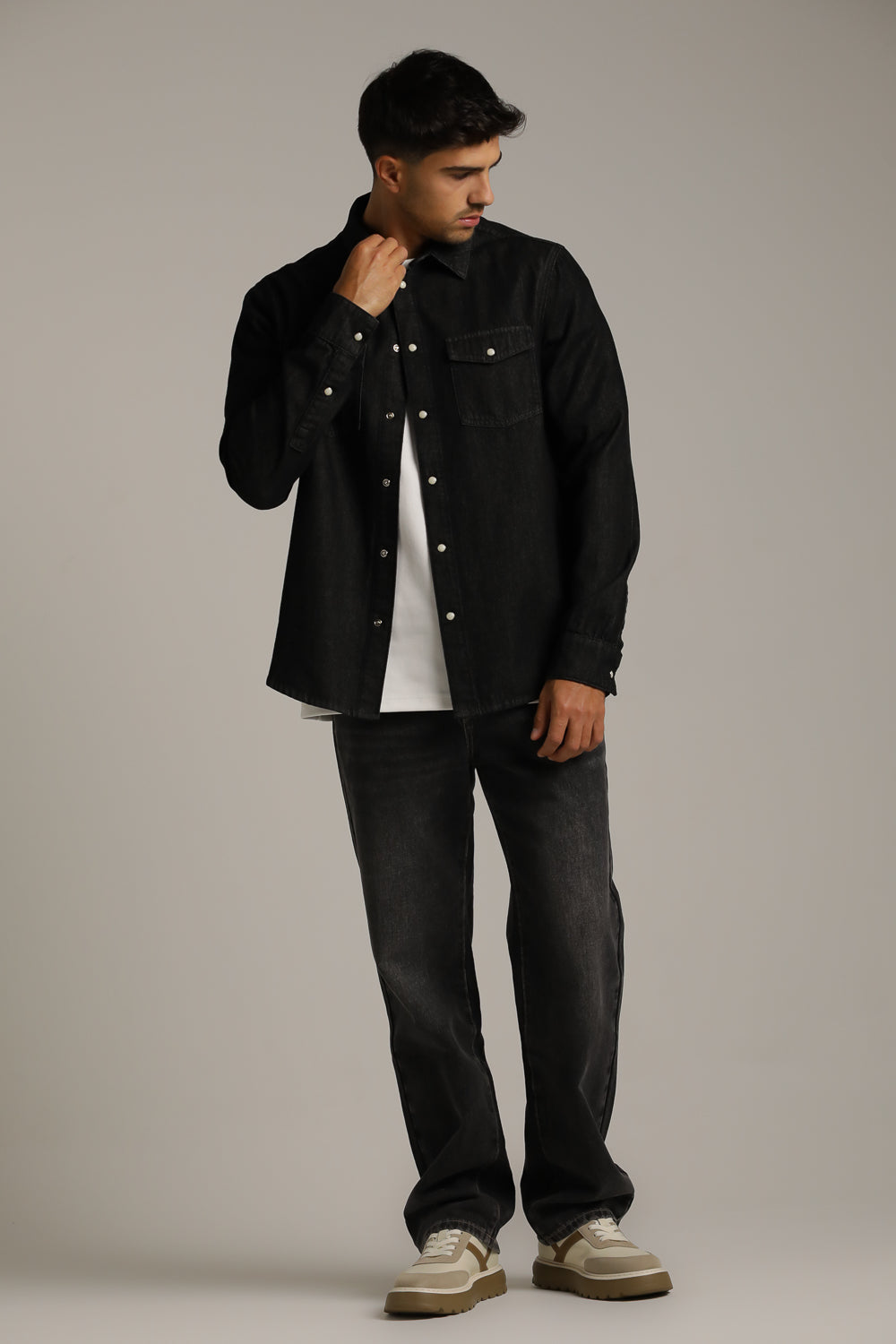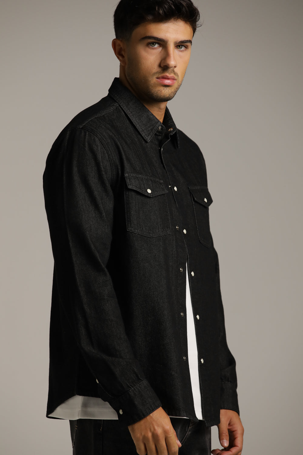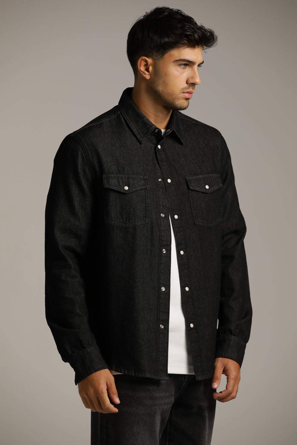 חולצה מכופתרת מבית המותג KENNETH COLE לגברים בצבע שחור, מעוצבת בסגנון ג'ינס, בעלת שרוולים ארוכים ובסופם כפתורי פנינה, צווארון מתקפל למראה אלגנטי, כיסים עם כיסוי דש בחלק העליון וכפתורי פנינה לפתיחה וסגירה של החולצה.