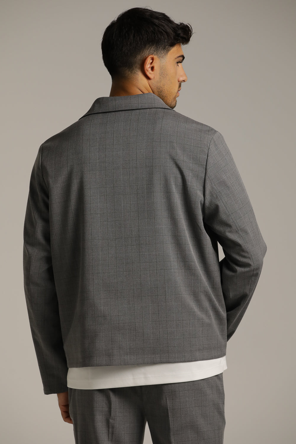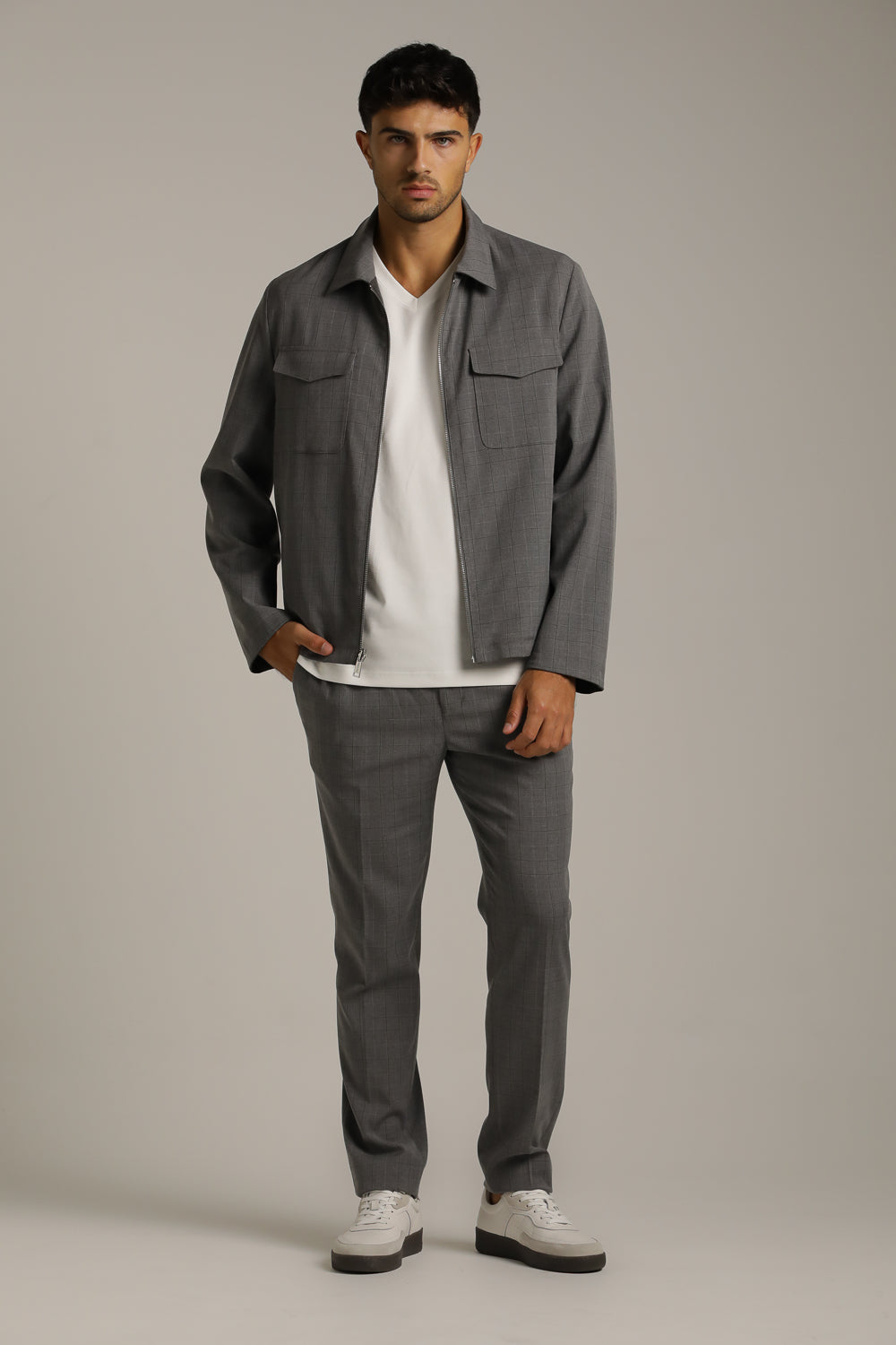 - צד אחד בצבע אפור בהיר, בעיצוב משבצות עדינות, מכיל כיסים רגילים בצדדים וכיסים עם סיגרת דש בחלק העליון.