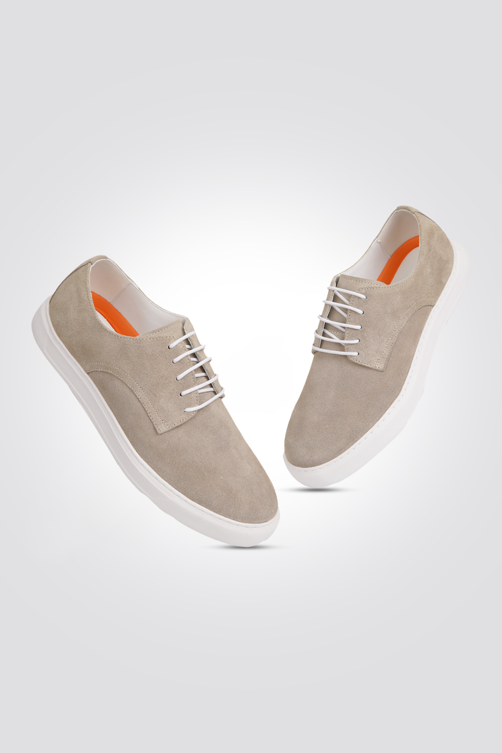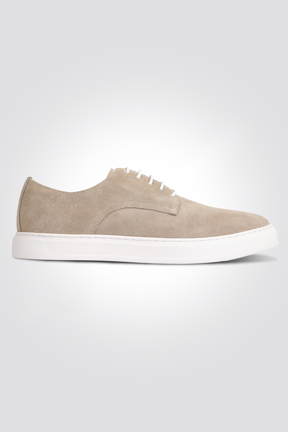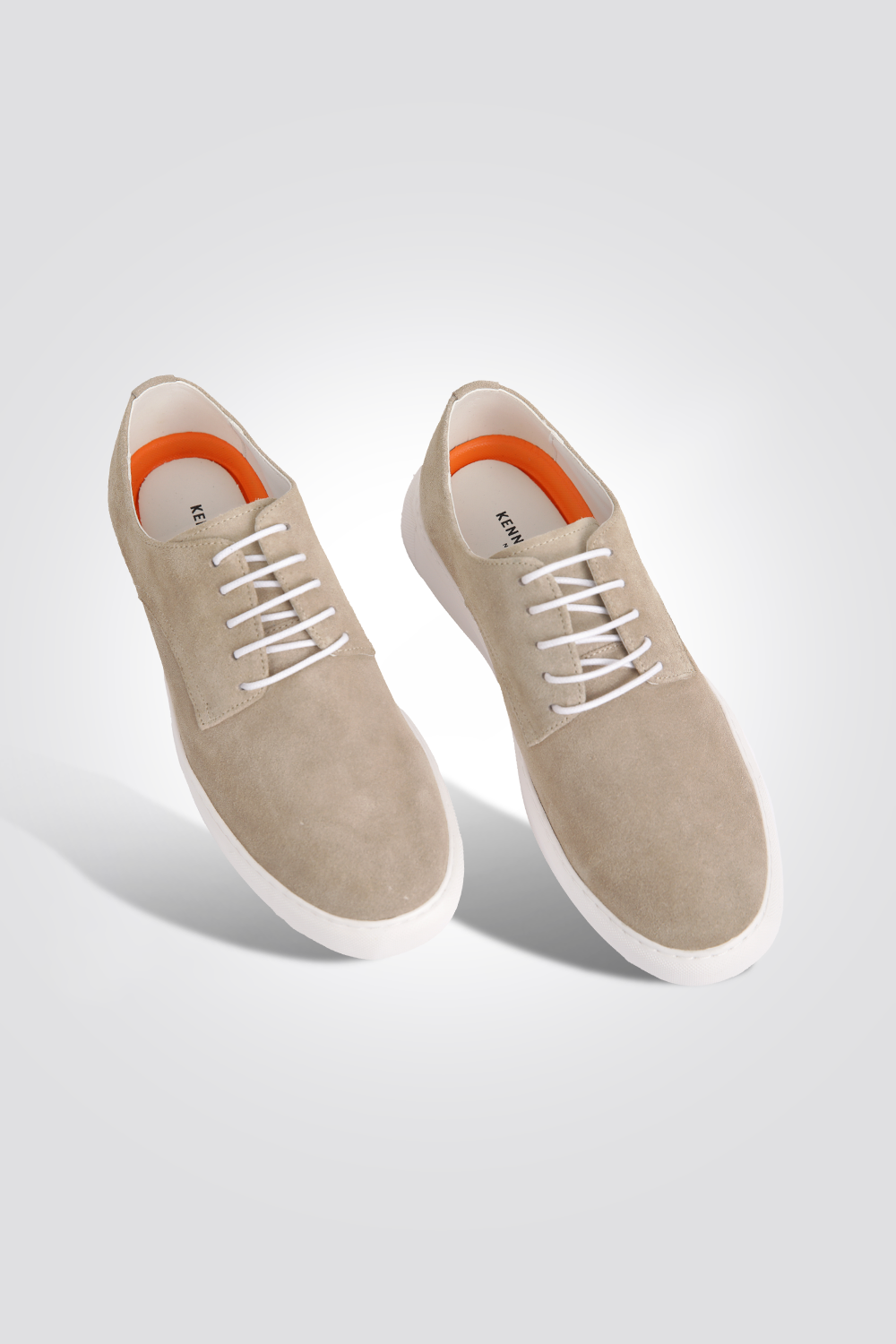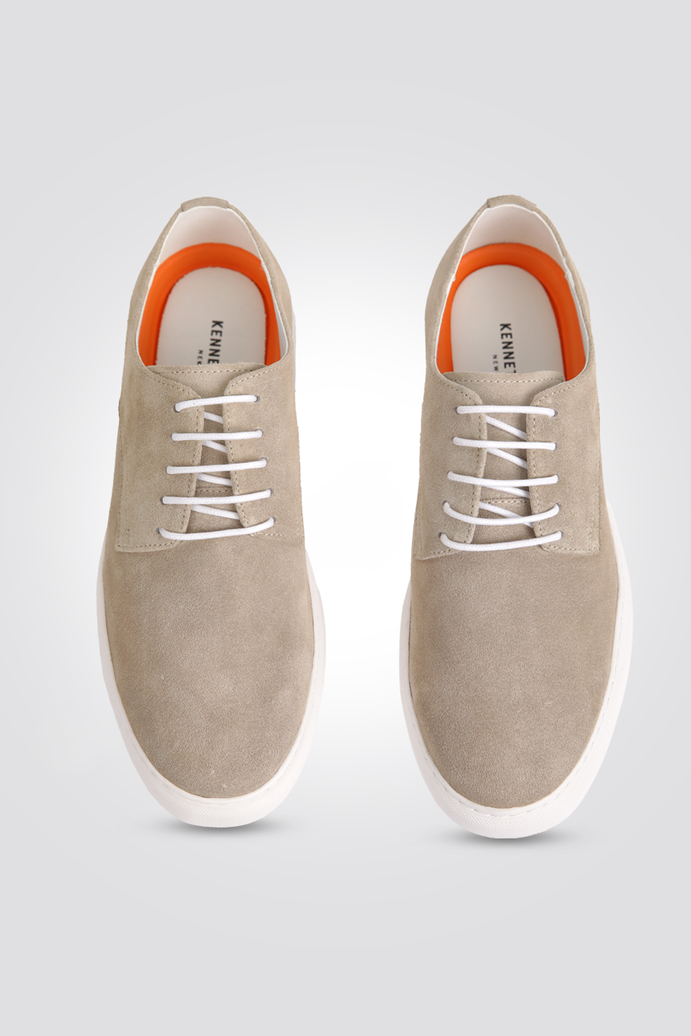 נעלי גברים אלגנטיות מהבית המותג היוקרתי KENNETH COLE עשויות עור איכותי בצבע בז', סוליה בצבע לבן ושרוכים לבנים דקורטיביים.