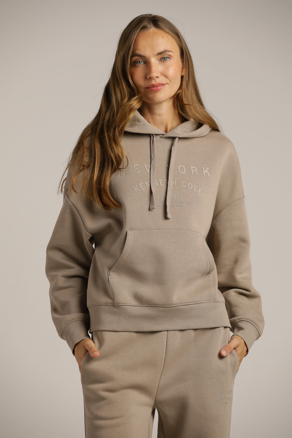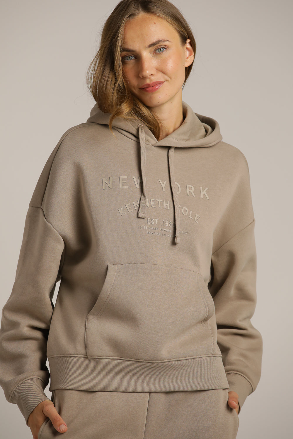 סווטשירט מבית המותג KENNETH COLE לנשים בצבע בז', עשוי מבד מחמם ורך למגע, בגזרת אוברסייז נוחה, בעל שרוולים ארוכים, כובע קפוצ'ון, כיס קנגרו קדמי ולוגו המותג בחזית.