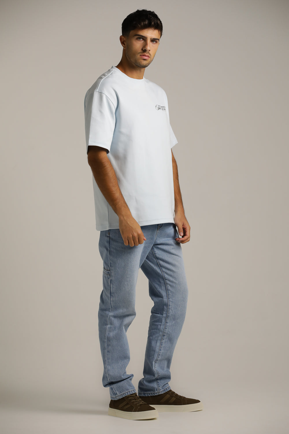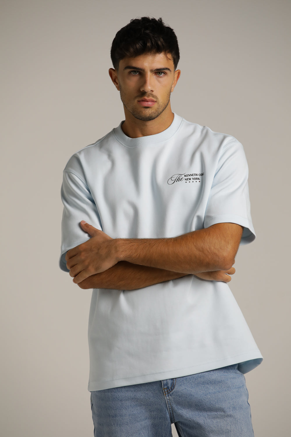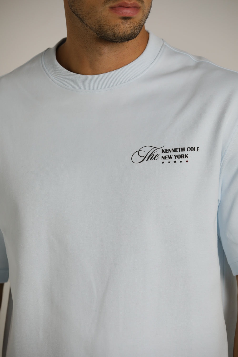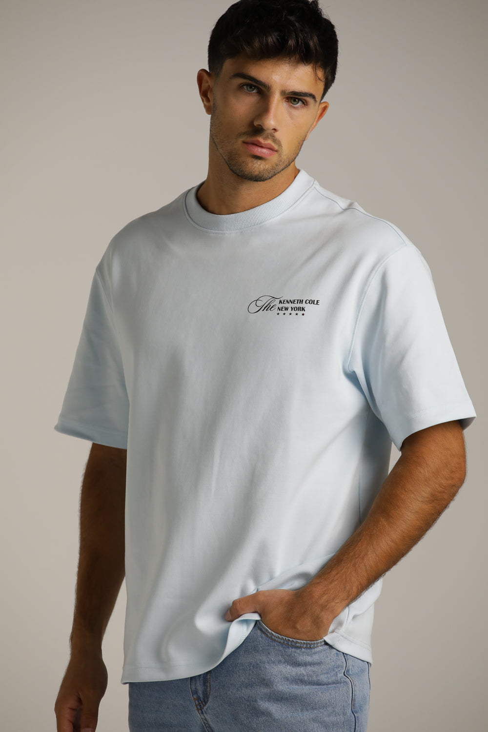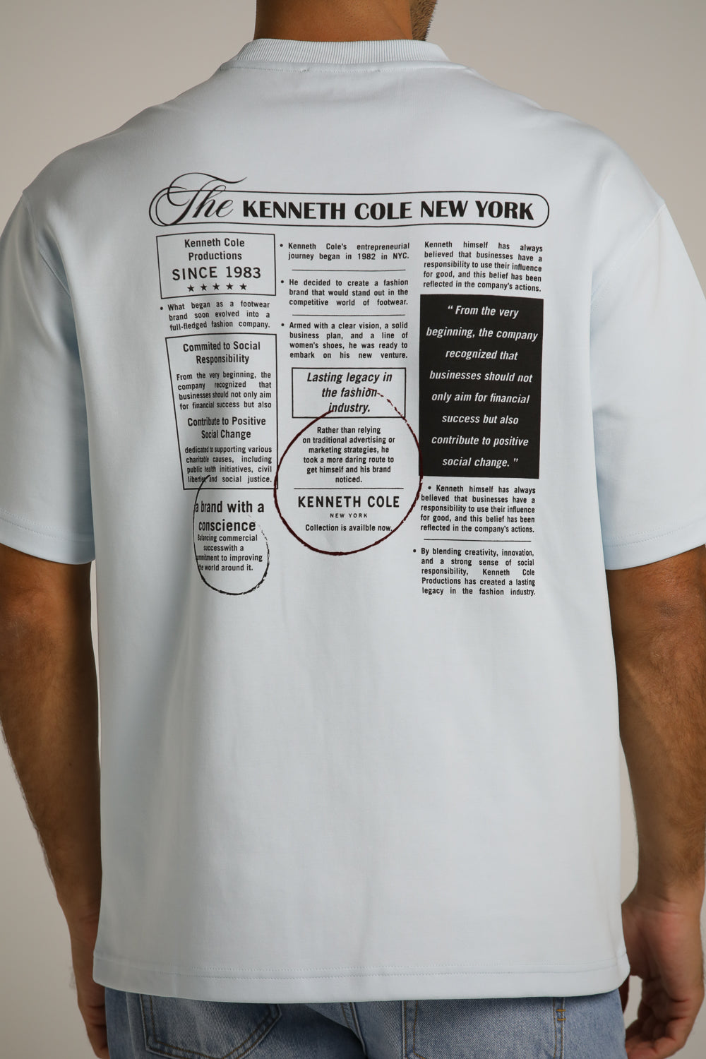 טישירט מבית המותג KENNETH COLE לגברים בצבע תכלת, בגזרת אוברסייז, מעוצבת עם פרינט בסגנון עיתון בגב החולצה, בעלת שרוולים קצרים, צווארון עגול והדפס לוגו המותג עם כוכבים מקדימה.