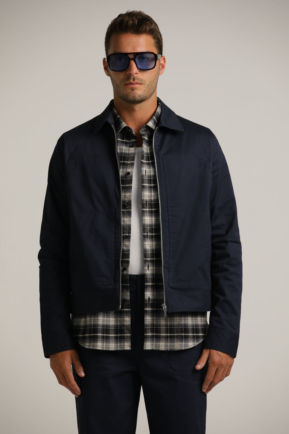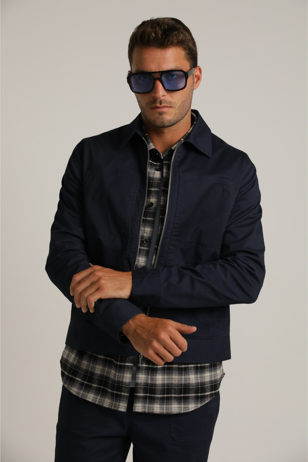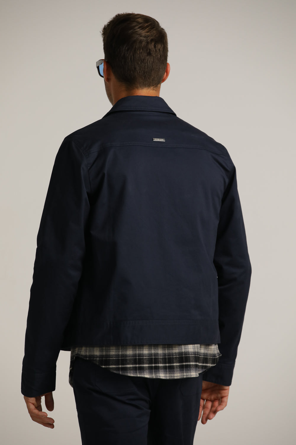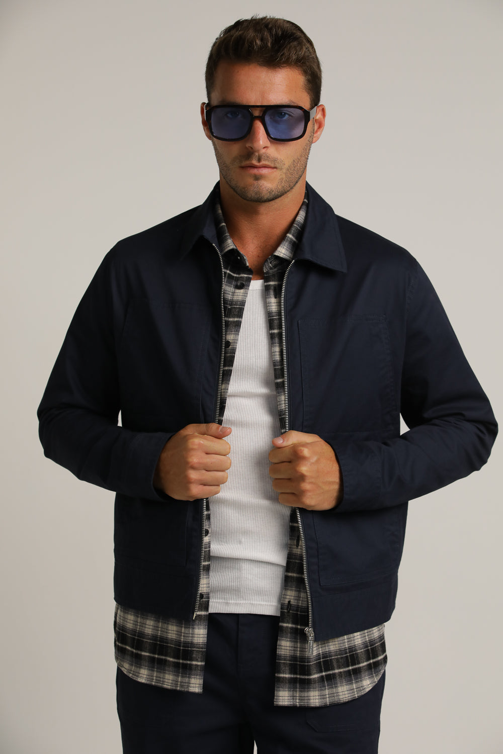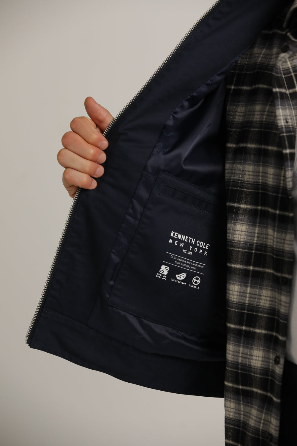 ג'קט מבית המותג KENNETH COLE לגברים בצבע נייבי, מעוצב בגזרת סלים קלאסית, בעל שרוולים ארוכים, שני כיסים חיצוניים וכיס פנימי, רוכסן לסגירה, צווארון מתקפל למראה אלגנטי ותגית מתכתית קטנה עם הטבעת לוגו המותג בגב הג'קט.