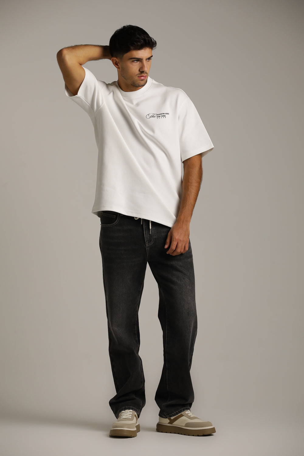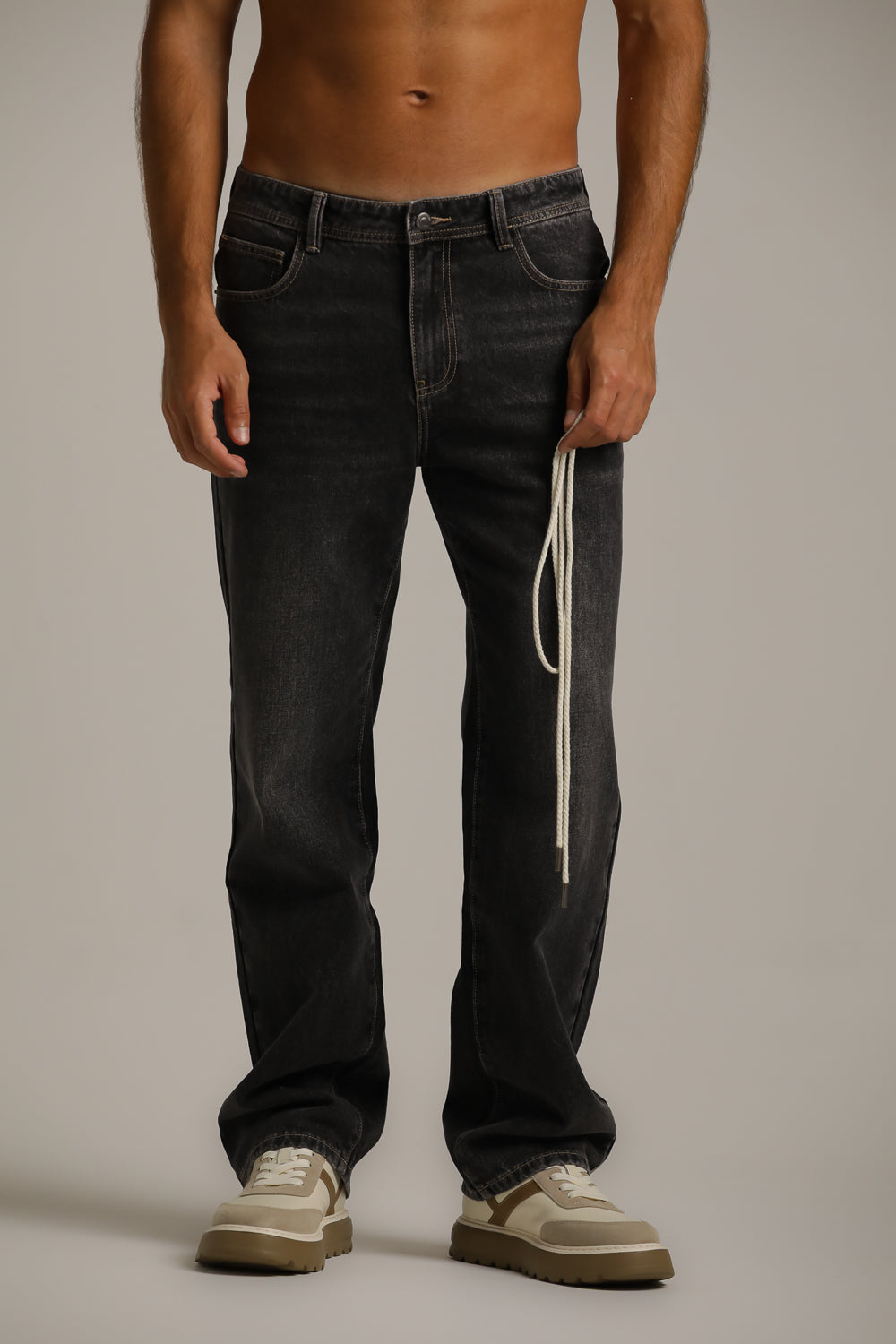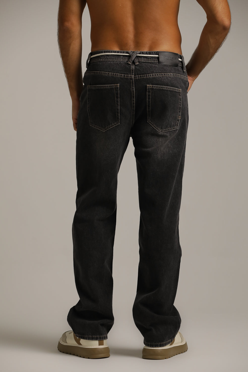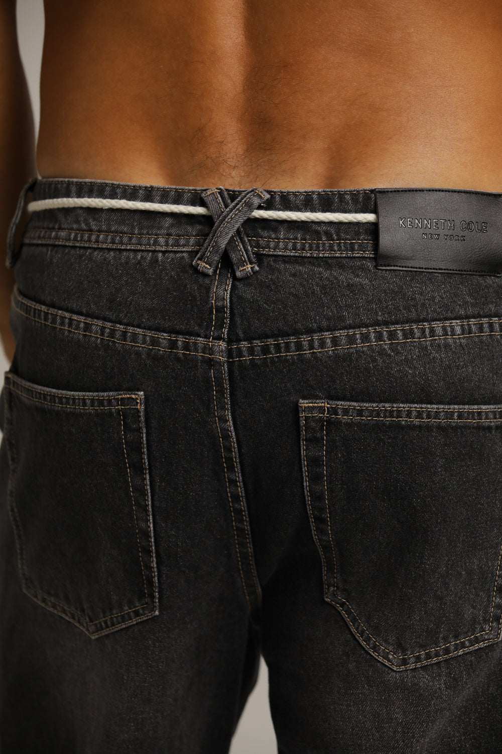 ג'ינס מבית המותג KENNETH COLE לגברים בצבע שחור, המעוצב במראה שטוף, בגזרת רחבה, בעל כיסים בצדדים, כפתור ורוכסן לפתיחה וסגירה ושרוך לבן לקשירה הניתן להסרה.