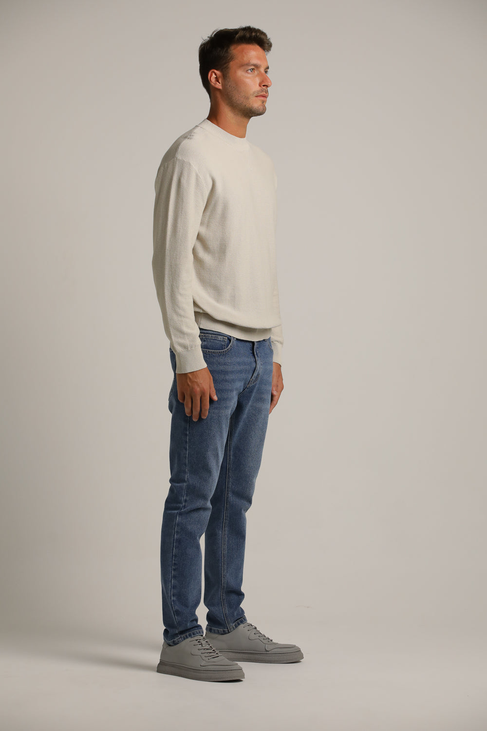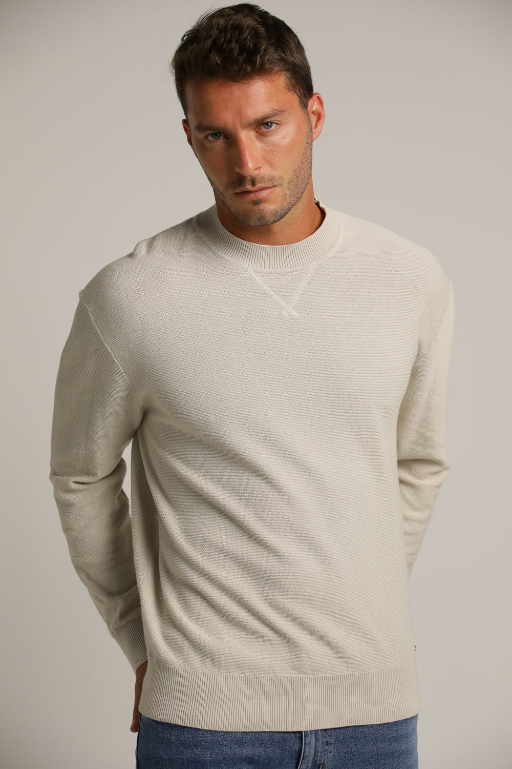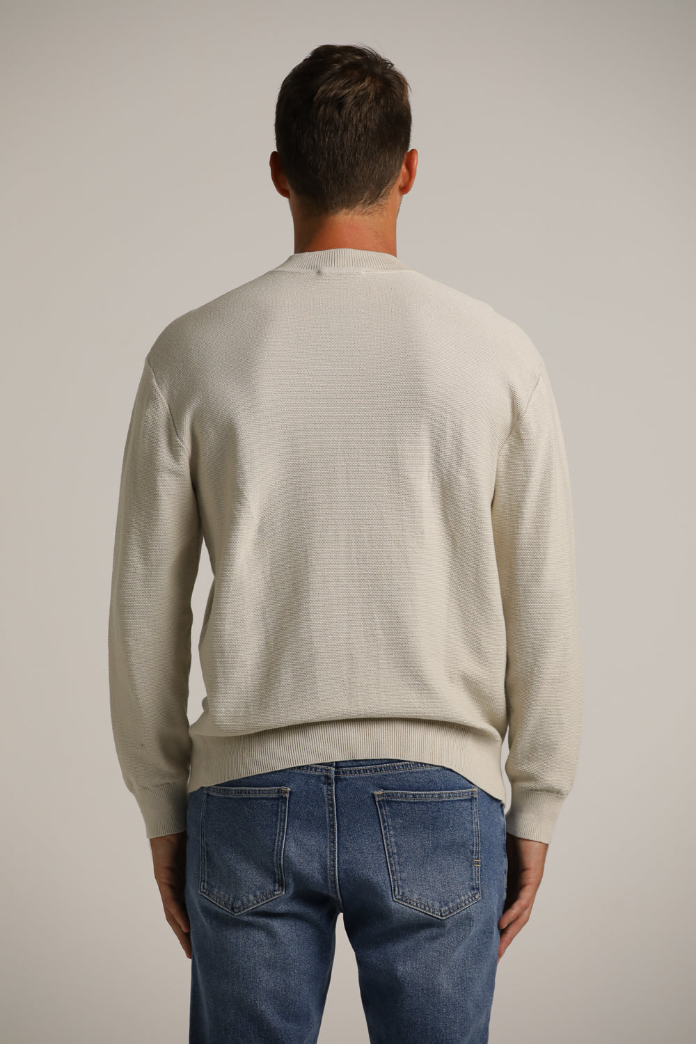 סריג דק מבית המותג KENNETH COLE לגברים בצבע שמנת, עשוי מבד 100% כותנה סרוג דק ונעים למגע עם מרקם אחיד, בעל צווארון עגול ופרט דקורטיבי בצורת משולש מתחת, שרוולים ארוכים וסיומת ריב בקצה הסריג, הצווארון והשרוולים.