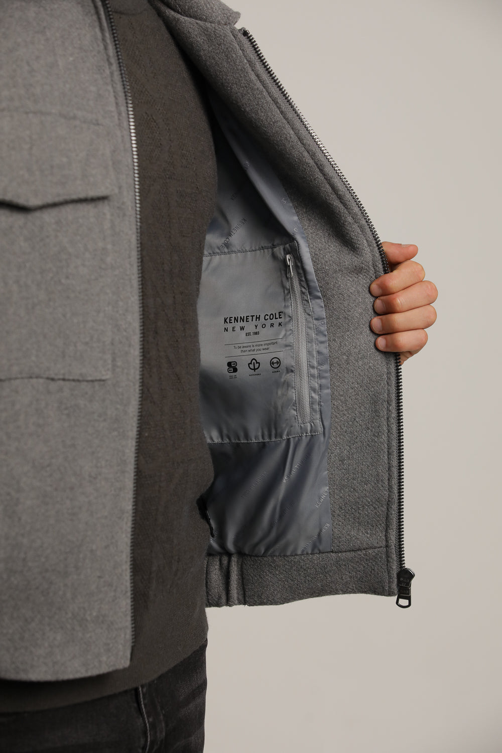 ג'קט מבית המותג KENNETH COLE לגברים בצבע אפור, עשוי בד עבה במרקם צמרירי נעים, בגזרת בומבר קצרה עם קווים נקיים ואלגנטיים למראה מודרני וקז'ואלי, בעל שרוולים ארוכים עם מכפלת, סגירת רוכסן מקדימה, צווארון קלאסי, כיס פנימי ושני כיסי חזה בעלי סגירת פאטצ'.