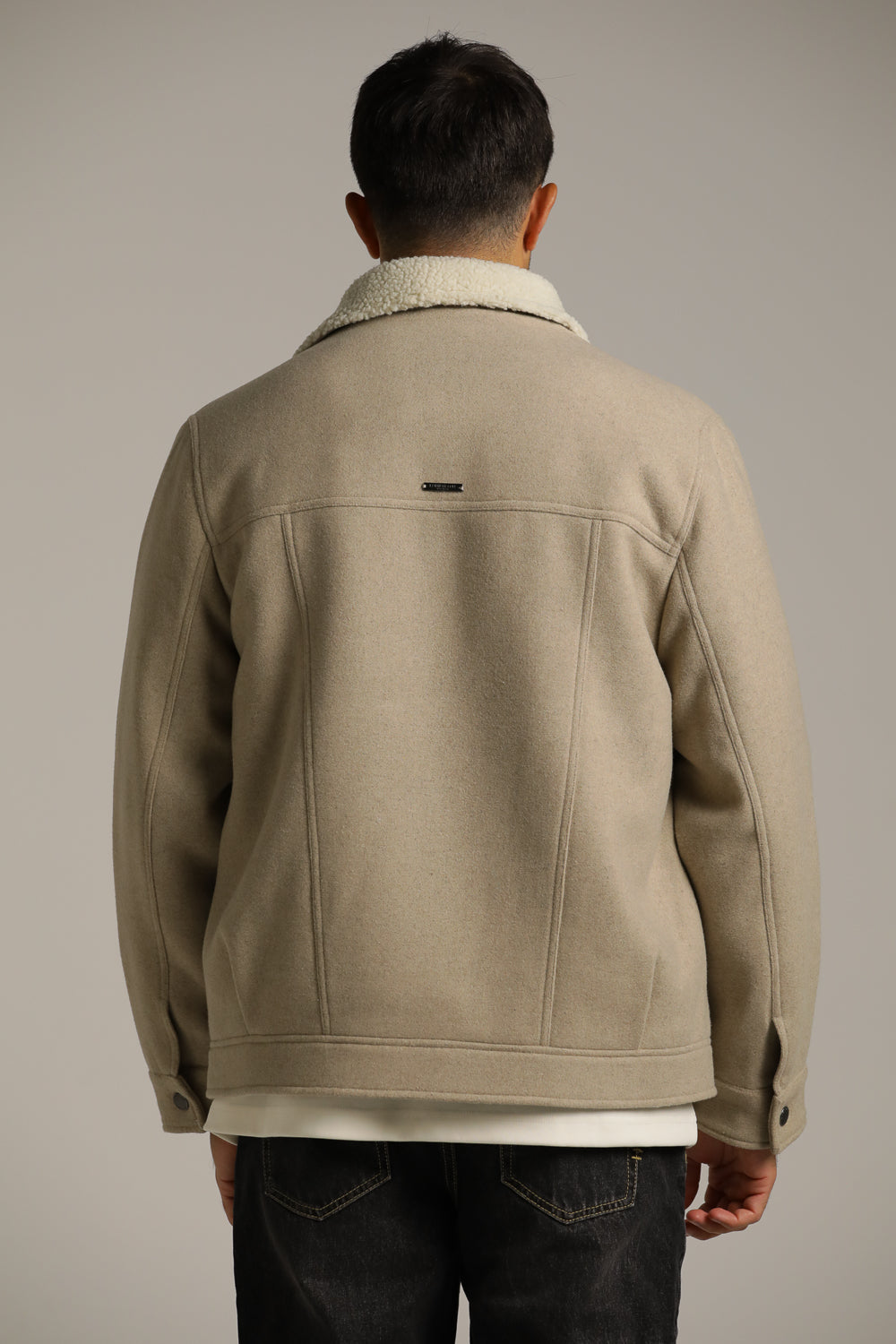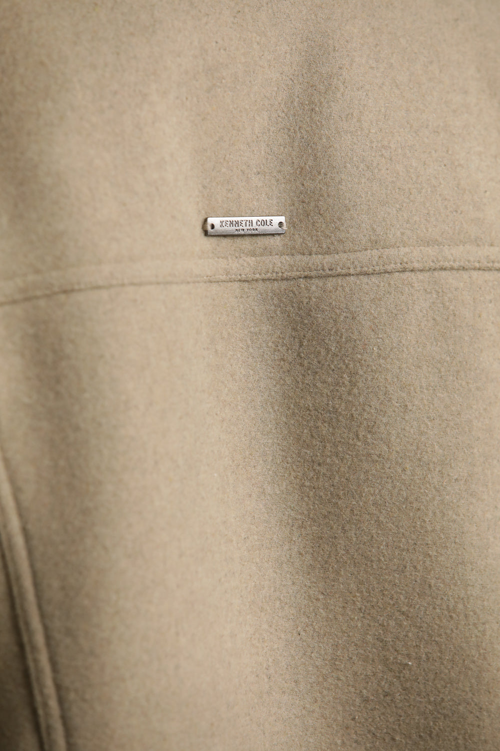 ג'קט טרקר מבית המותג KENNETH COLE לגברים בצבע בז', מחמם ונעים, בעל בטנה פנימית במראה פרווה טבעונית מחממת, שרוולים ארוכים, שני כיסים רגילים בצדדים ושני כיסים עם כיסוי דש בחלק העליון, צווארון מתקפל, כפתורים לסגירה ותגית מתכתית קטנה עם הטבעת לוגו המותג בגב הג'קט.
