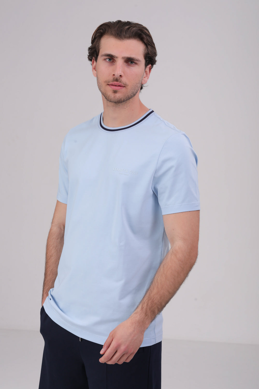 חולצת טי מבית המותג KENNETH COLE לגברים, עשויה מבד קליל, שרוולים קצרים, צווארון עגול וסמל המותג בקידמת החולצה.