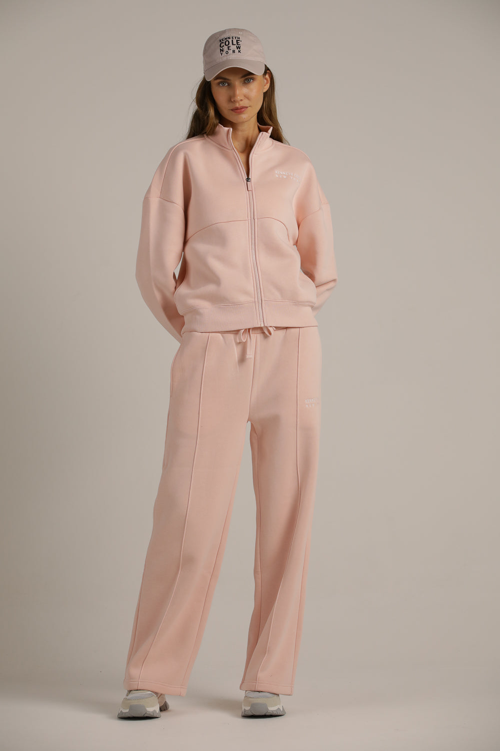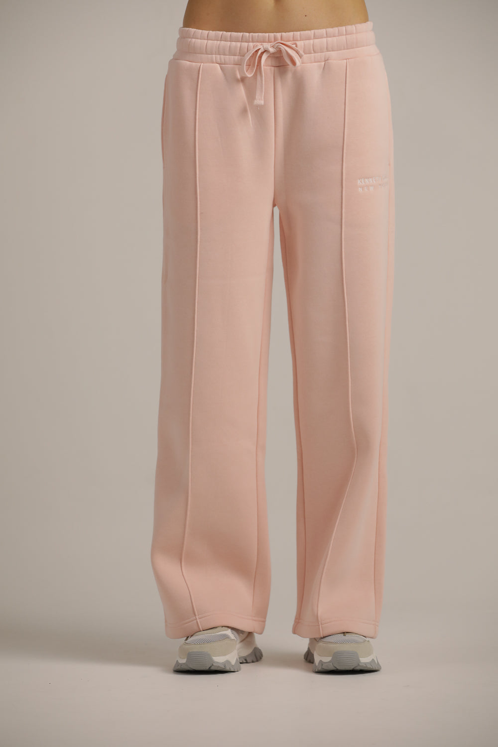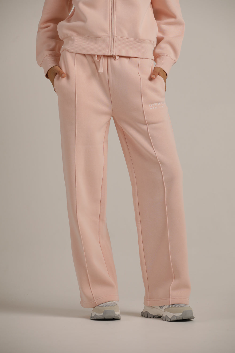 מכנסי טרנינג מבית המותג KENNETH COLE לנשים בצבע ורוד, עשויים מבד רך ונעים למגע, בגזרה רחבה נוחה ומחמיאה, מכילים גומי אלסטי במותן ושרוכים לקשירה, שני כיסים בצדדים וכיס אחורי ולוגו המותג בצד.