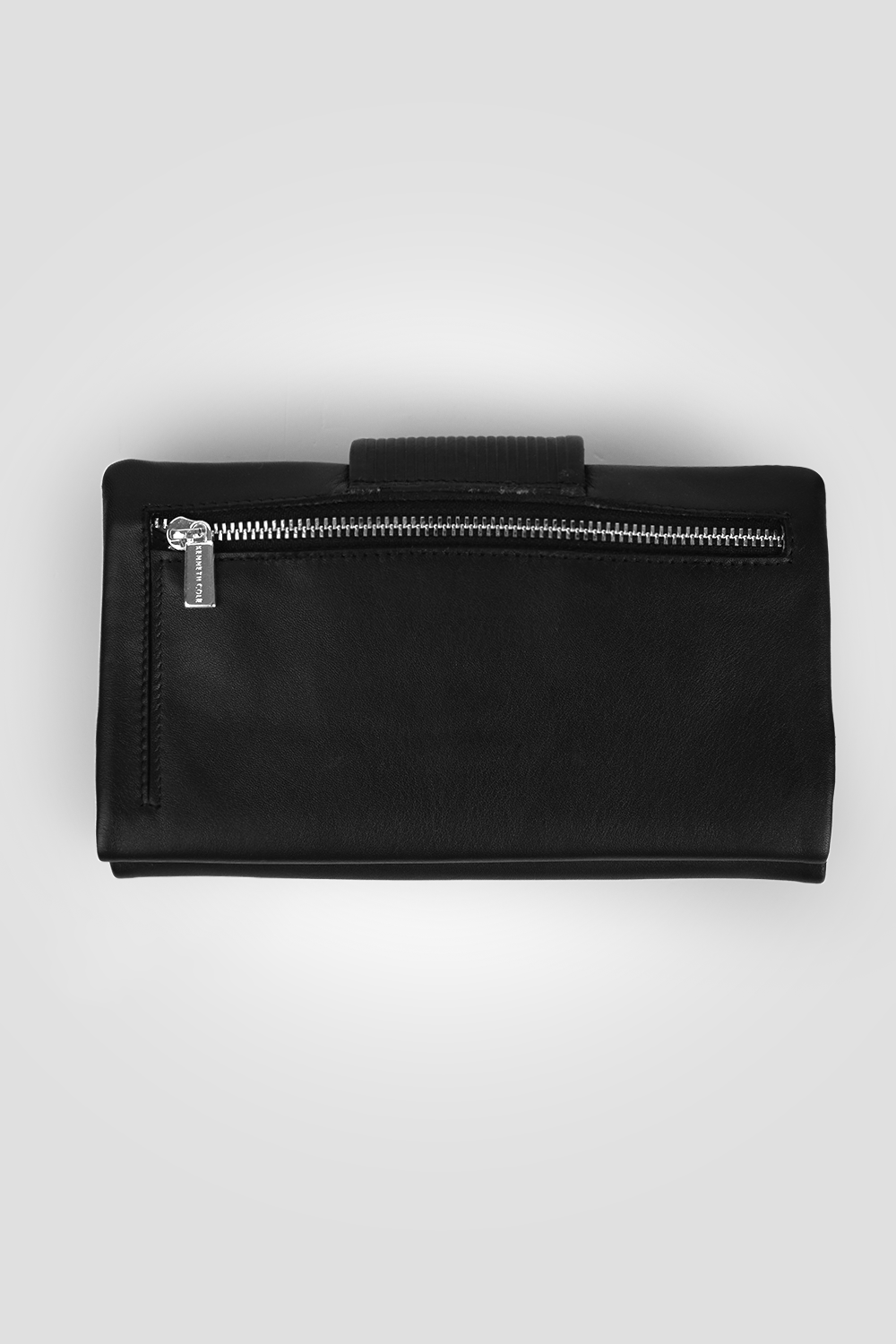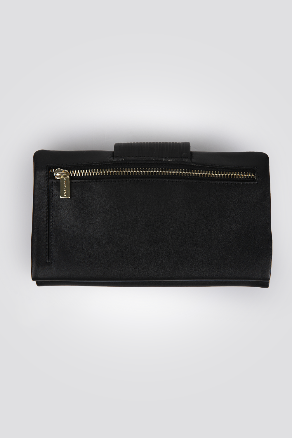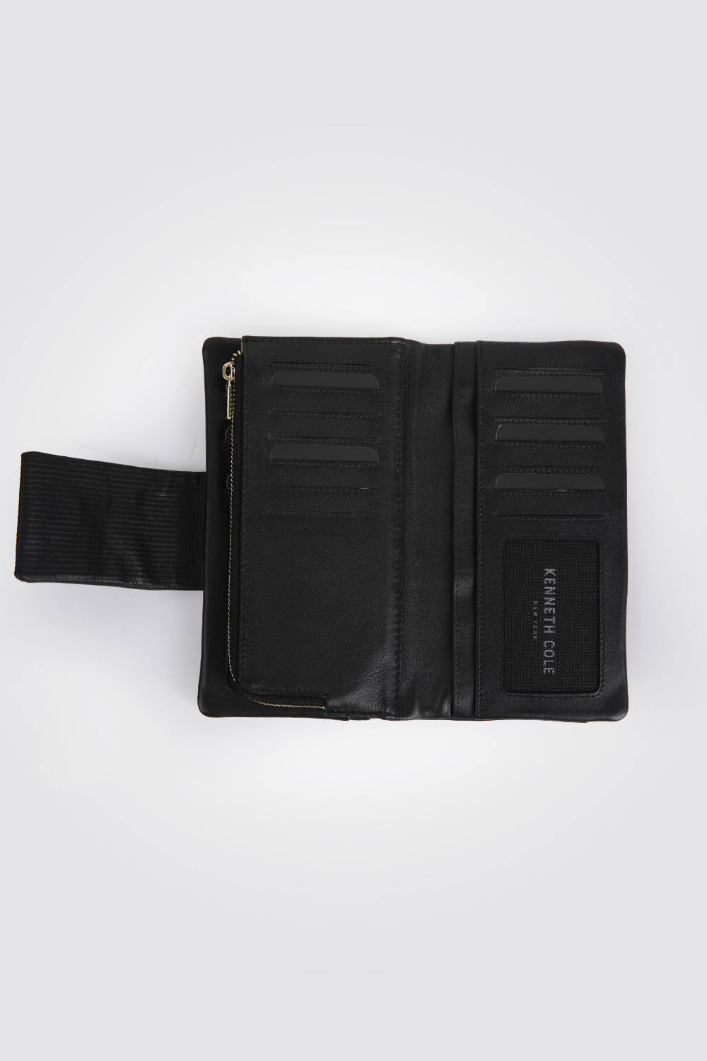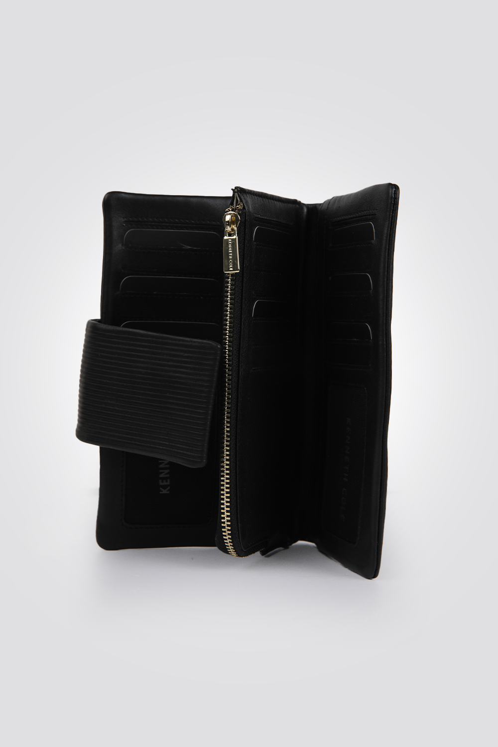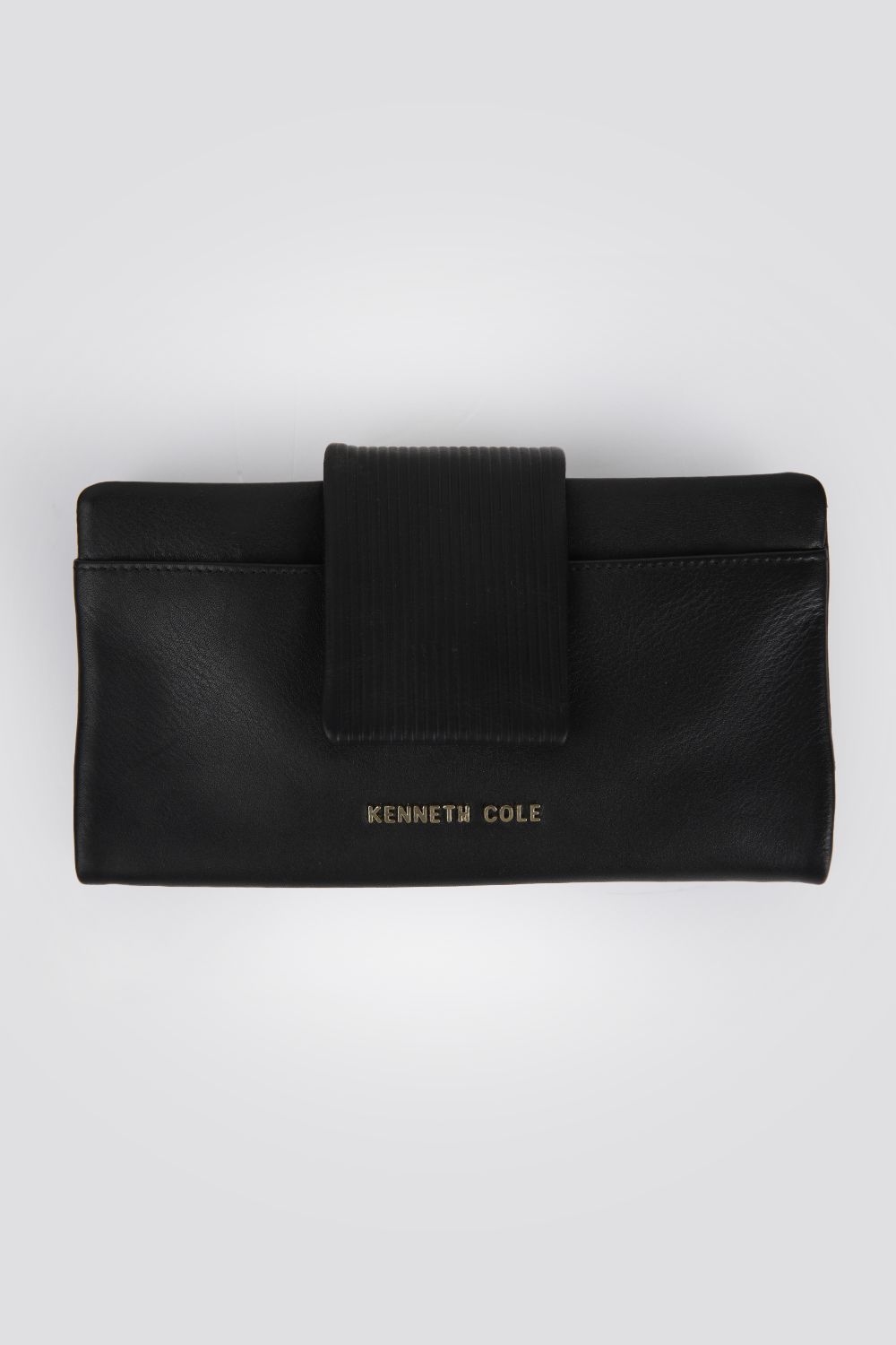 ארנק עור מבית המותג KENNETH COLE בצבע שחור עם תאים לכרטיסים ותא מרכזי עם סגירת רוכסן, כיס אחורי וסגירת מגנט ראשית.